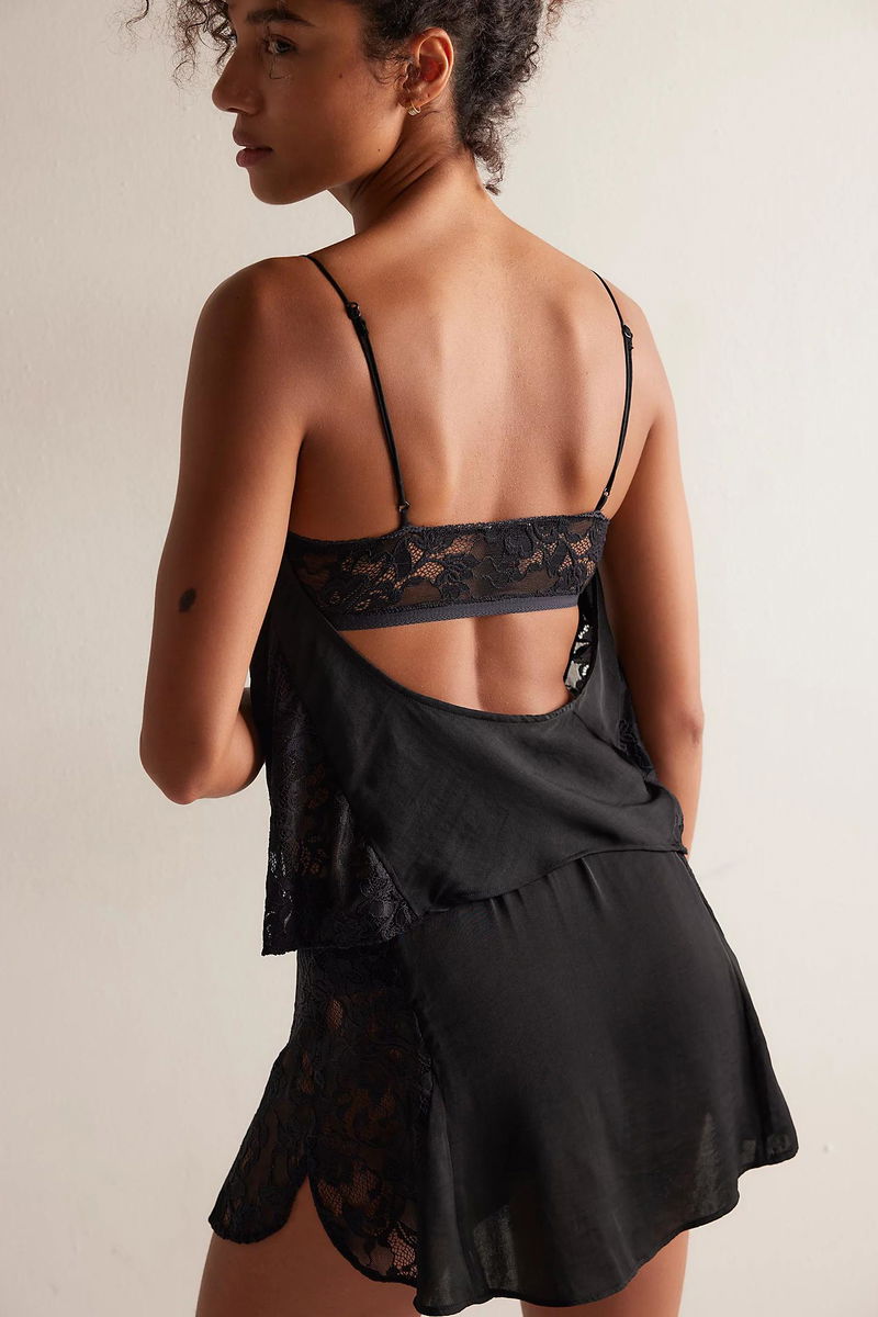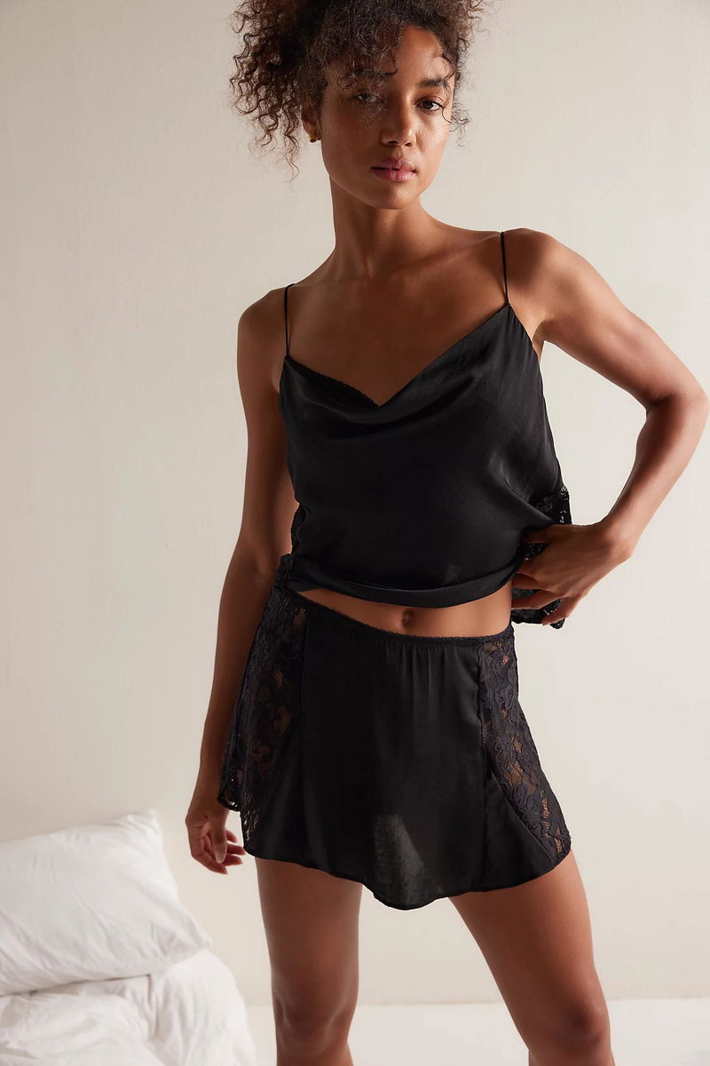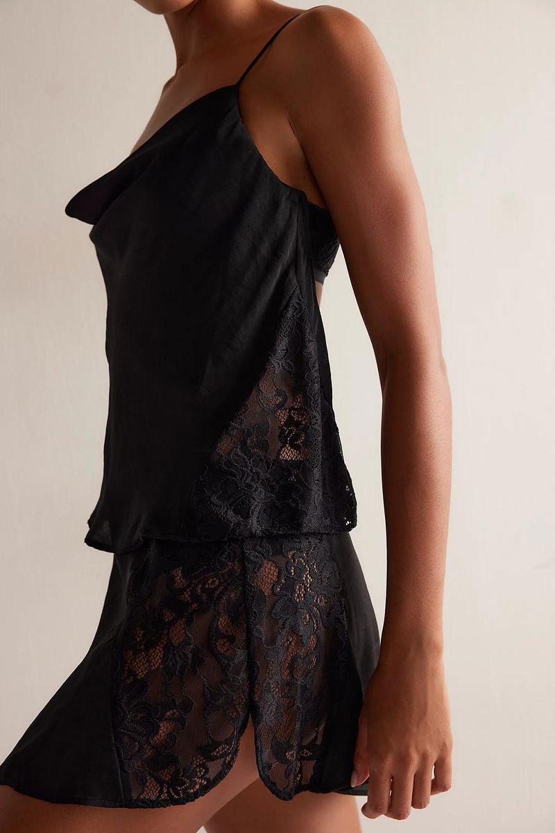 Have it all with this chic yet comfy slip set from Intimately, featuring lovely lace inlays throughout, a fluttery, handkerchief-like mini skirt, and a gorgeous cowl-neck top, complete with an open back for a stunning, sultry finish.