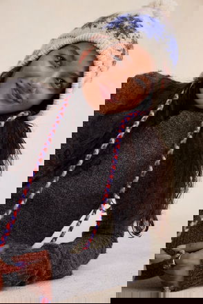 A cold-weather staple, this chunky knit beanie comes complete with an oversized pom and fun striped print. Beanie style, knit fabrication, upturned cuff, marled striped pattern, attached oversized pom.