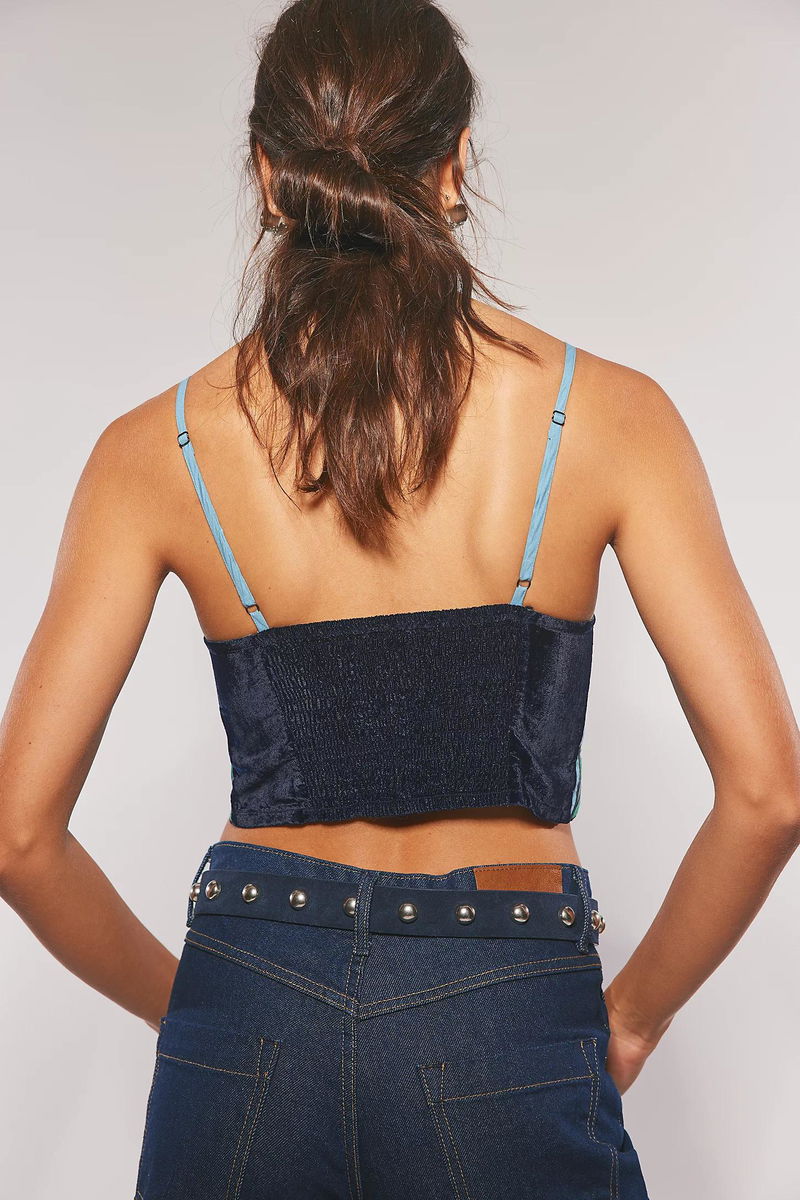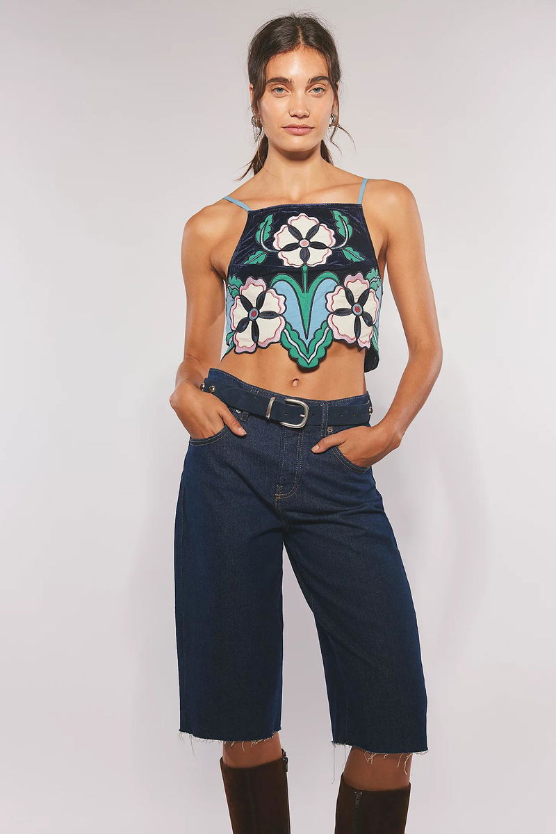 Effortlessly exquisite, this stunning top features a luxe crushed velvet fabrication, a boxy, super-cropped fit, and enchanting lotus appliques that add a touch of whimsy and allure.