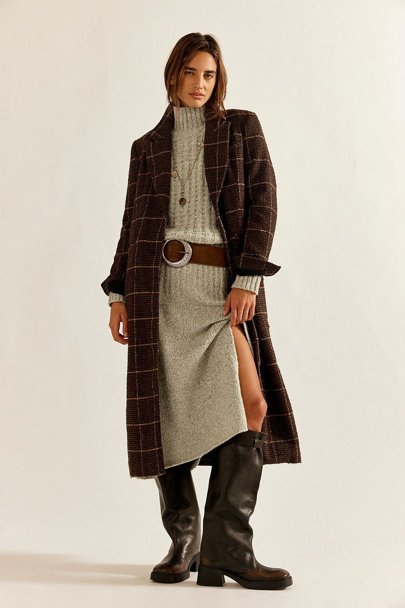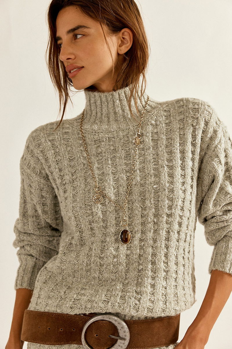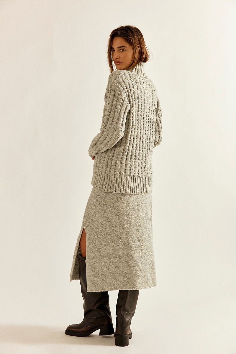 So cozy and so refined, this effortless skirt set features a relaxed turtleneck top made from a chunky waffle knit fabrication, along with a coordinating column-style midi skirt for the perfect two-piece design.