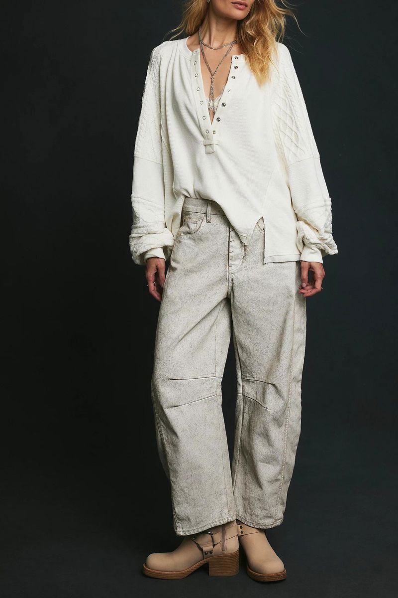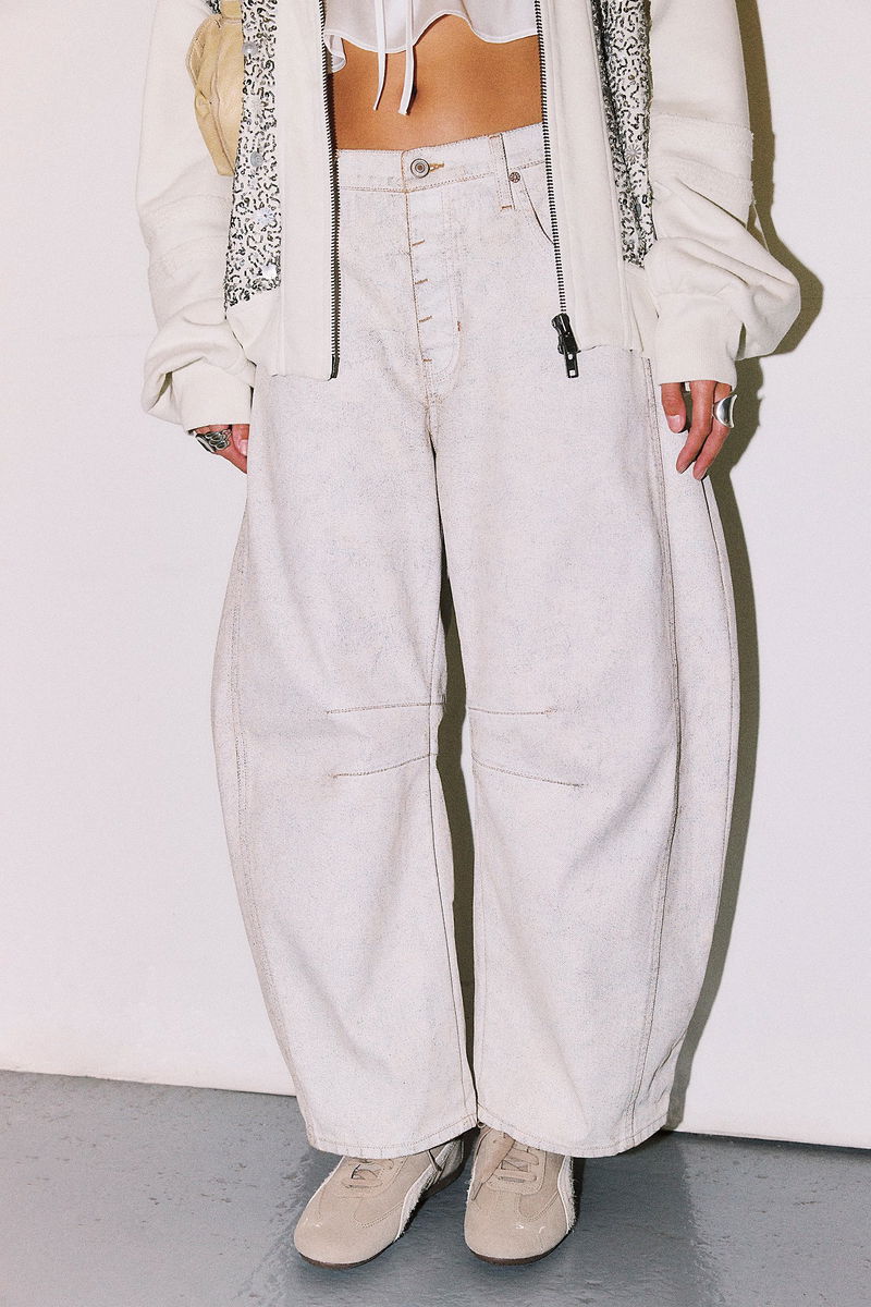 Our most-loved barrel jeans from our We The Free collection, now featured in the coolest, coated fabrication.