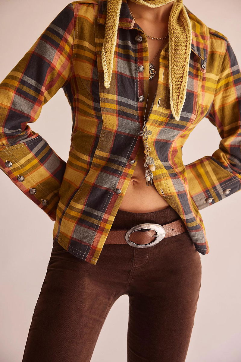 Tailored to perfection, this exquisite button-down top from our We The Free collection features a flattering, fitted design, dramatic, elongated cuffs, and charming embroidered patches for a collegiate-inspired look.