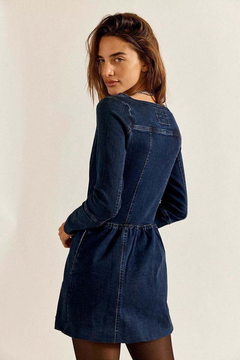 Totally tailored and so sleek, this mini dress from our We The Free collection features a structured fit-and-flare silhouette, stunning mother-of-pearl buttons, and a sturdy denim fabrication for a timeless touch.