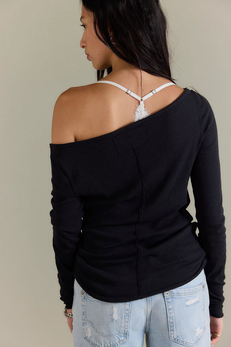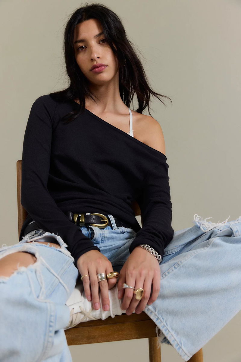 An off-the-shoulder neckline and semi-sheer cotton jersey fabrication make this fitted long sleeve from We The Free a truly flattering staple style.