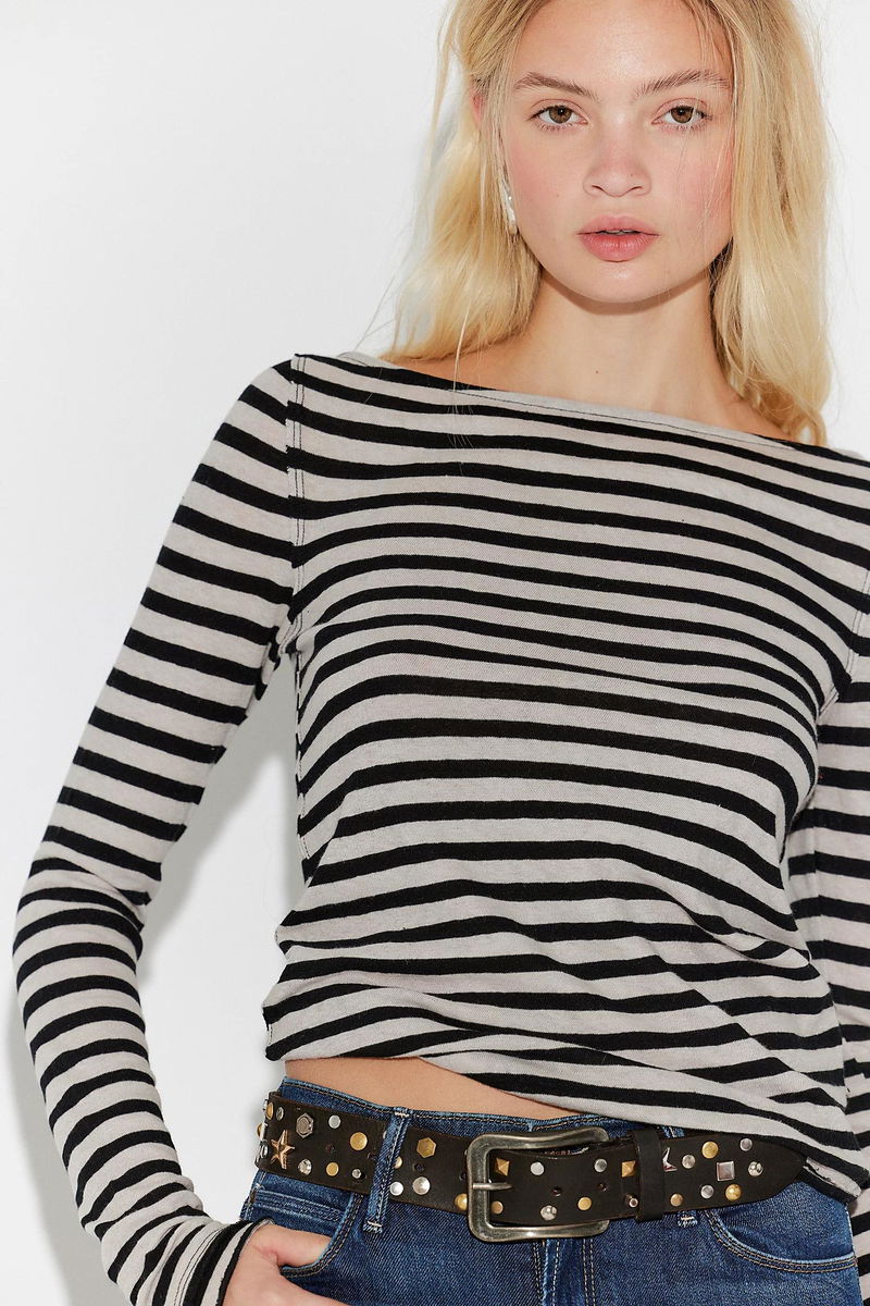 An off-the-shoulder neckline and semi-sheer cotton jersey fabrication make this fitted, long-sleeve from We The Free a truly flattering staple style.