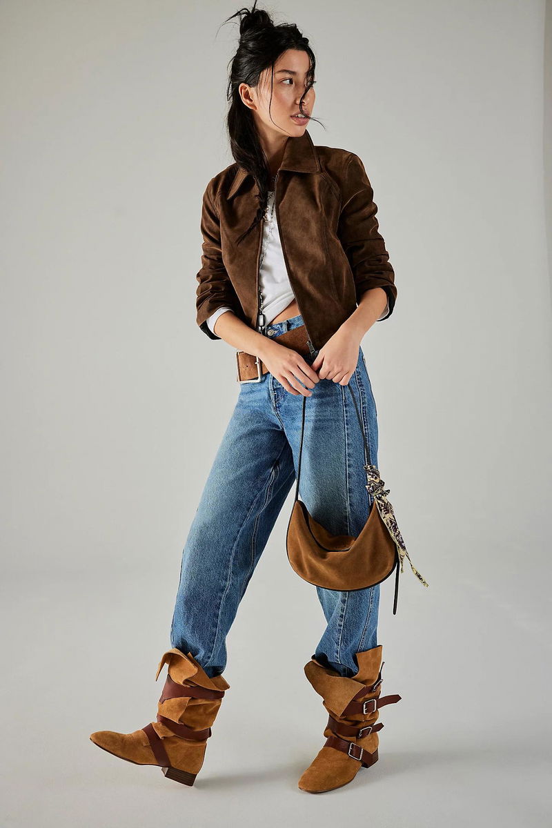 Turn back time with this 70s-inspired, sleek vegan suede jacket from We the Free, featured in a cropped fit with a classic pointed collar and wide cuffs.