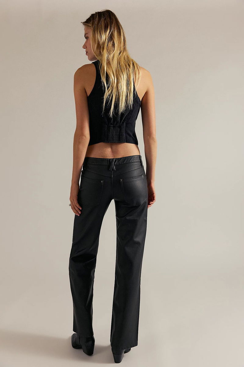 Effortlessly edgy, these bold pants feature a buttery vegan leather fabrication, a classic wide-leg silhouette, and a low-rise hip-hugging design for added flair.