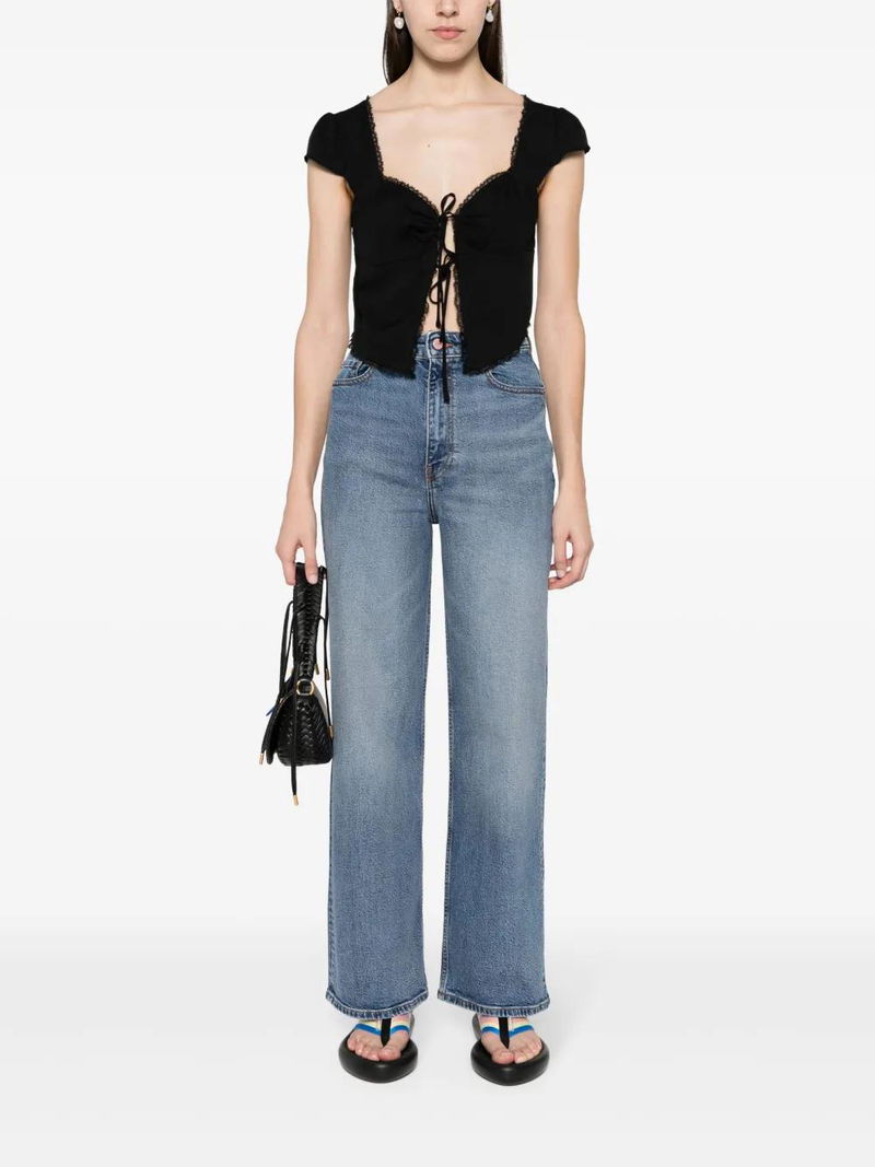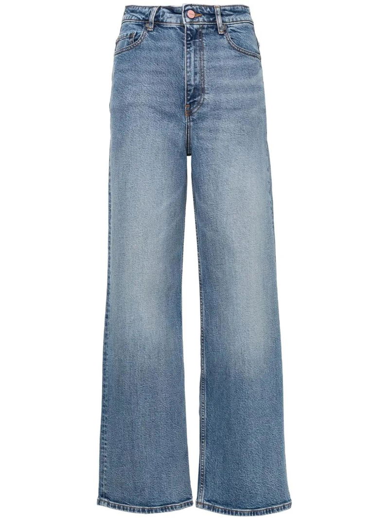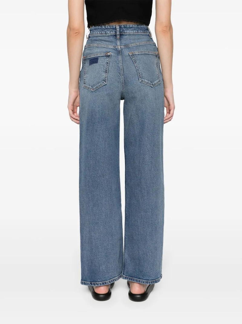 indigo blue stretch organic cotton washed denim contrast stitching high-rise belt loops classic five pockets whiskering effect full-length logo patch to the rear straight wide leg concealed fly and button fastening.
