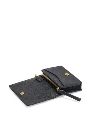Brown, gold-tone hardware, snap fastening, card slots.