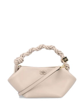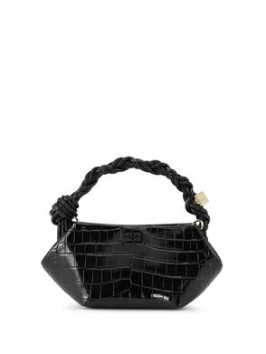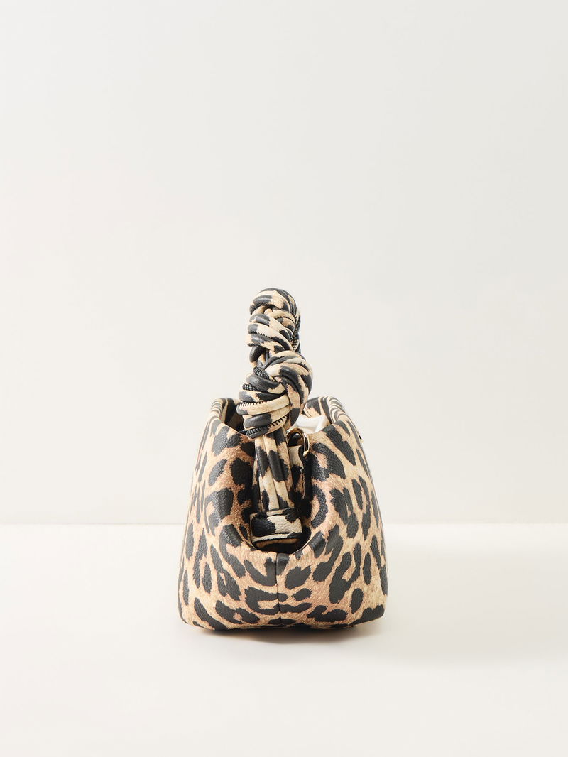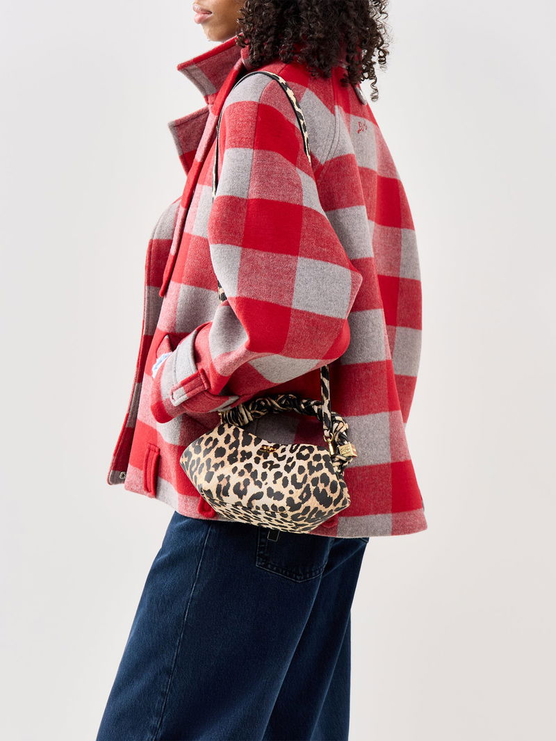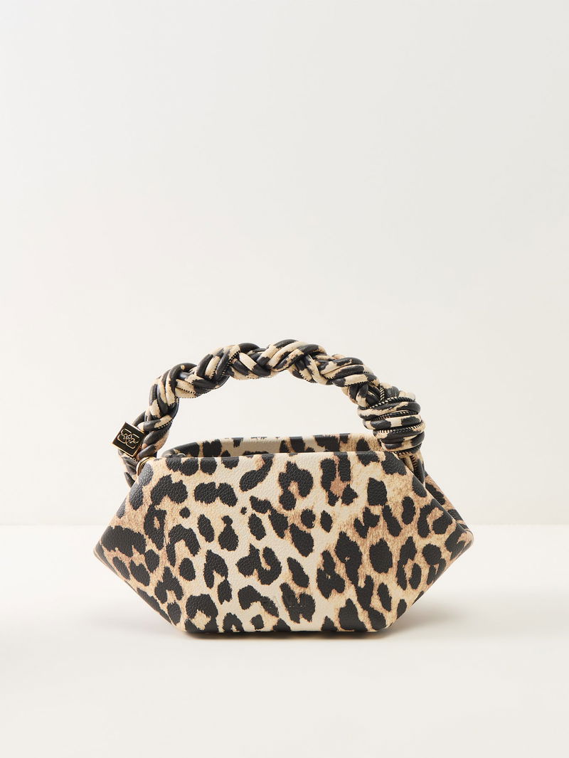 The Bou Mini Bag by Ganni features a leopard print finish with a compact structured silhouette. A statement mini handbag, it’s a distinctive addition to contemporary accessories and everyday styling.