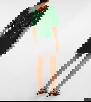 This top is decorated with glittering sequins and features a flattering open back with bold bow accents.