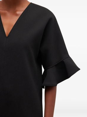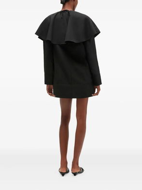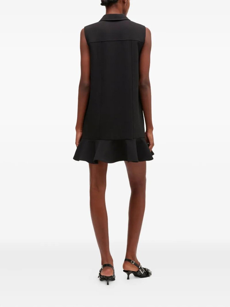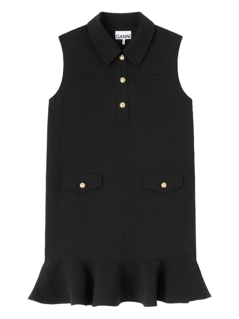 Black gold-tone buttons point collar sleeveless two front pockets ruffled hem.