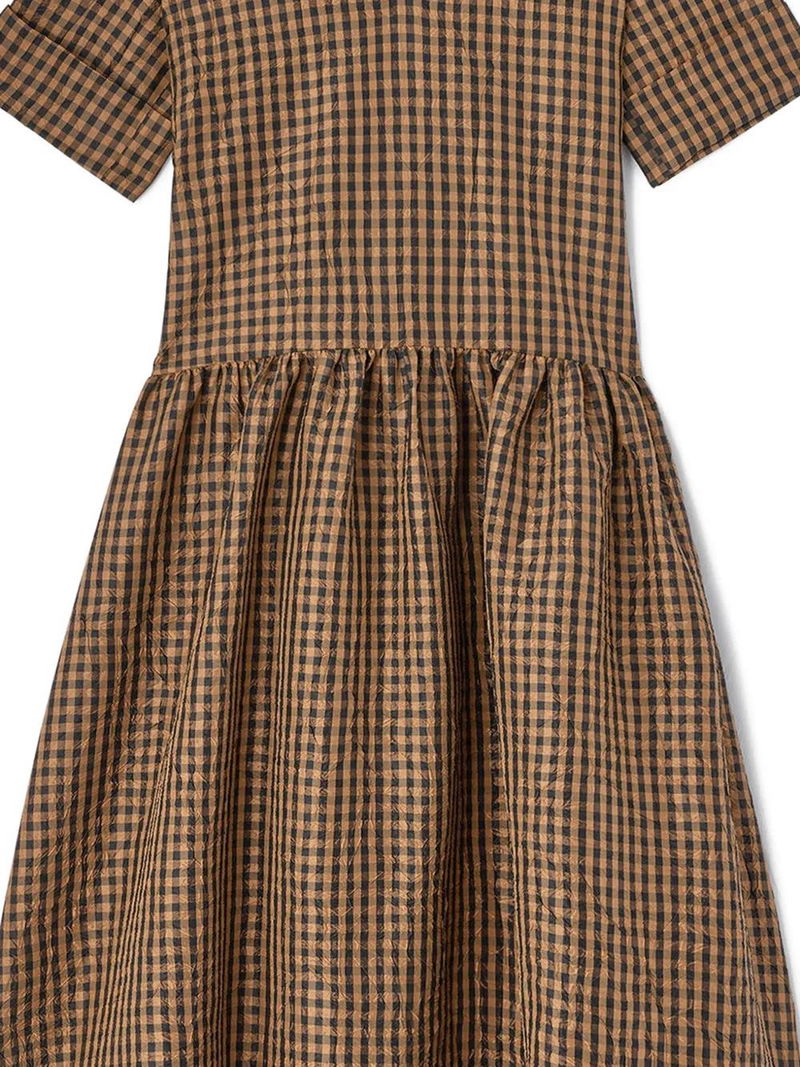 Tobacco brown check pattern V-neck short-sleeved crinkled finish gathered detail.