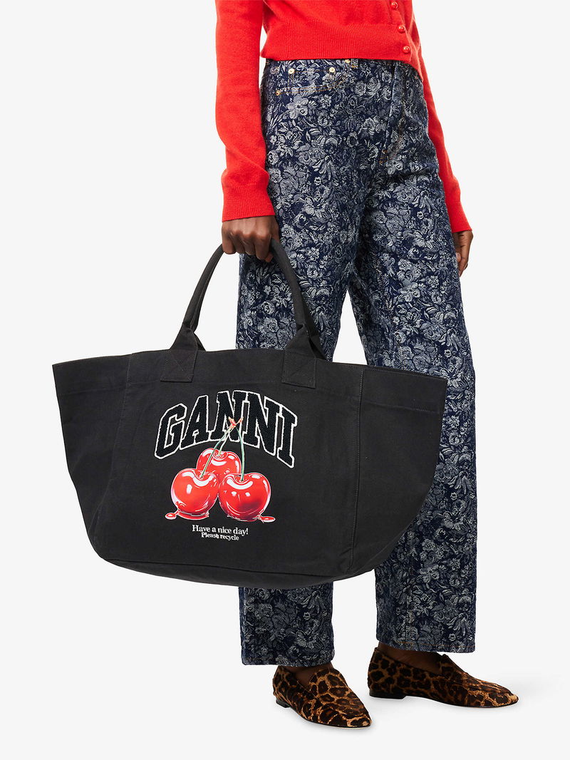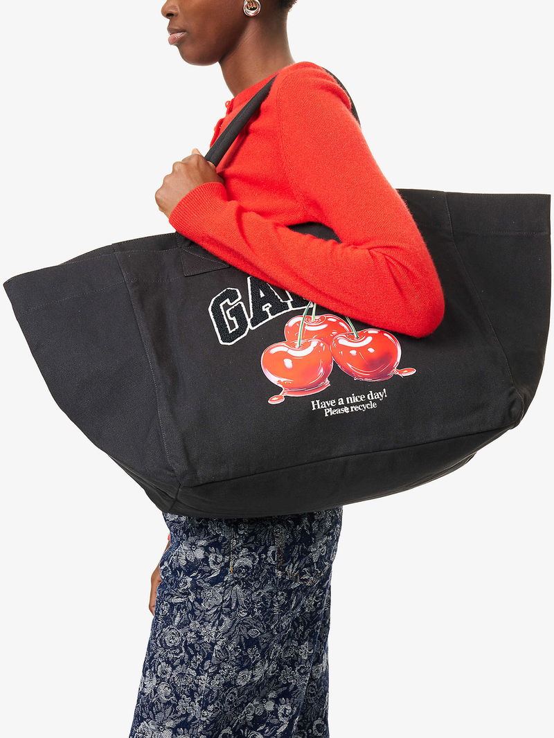 GANNI cotton-canvas shopper bag. Structured shape, two top handles, one main compartment, one interior zip pocket, cherry graphic print at front, slogan print at front.