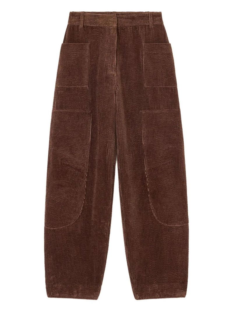 Chicory coffee, corduroy texture, front patch pockets, back welt pocket, belt loops.