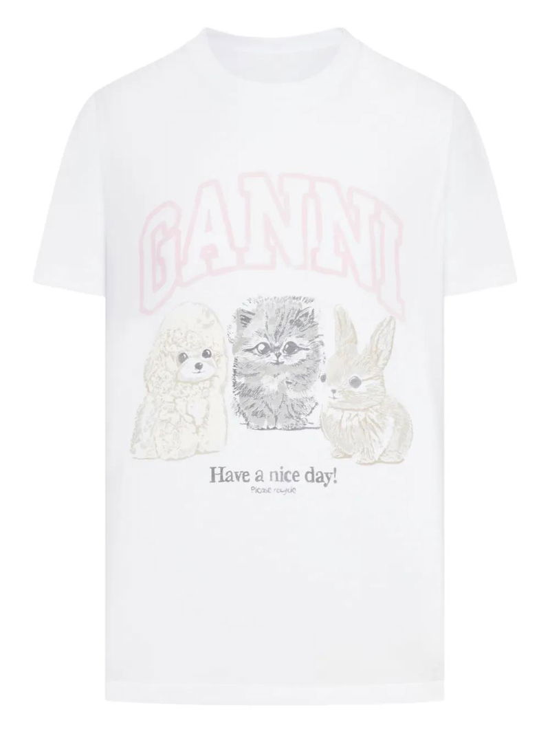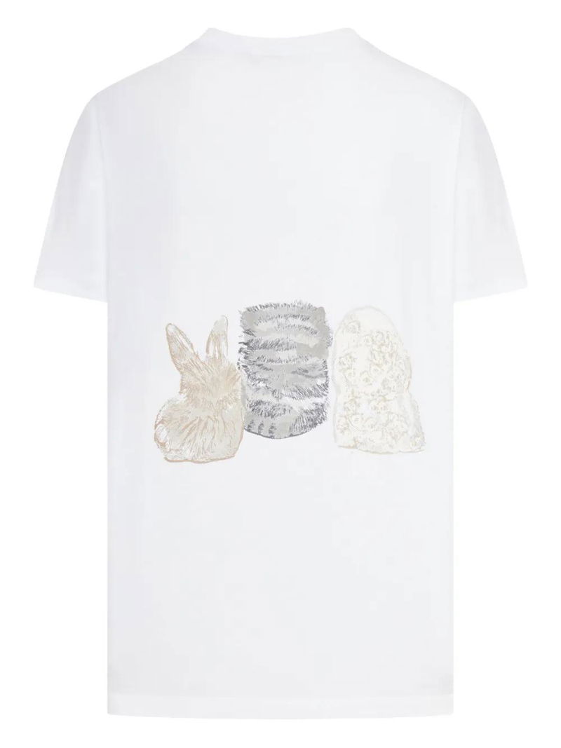 White, cotton, dog, cat and rabbit print. logo lettering print, short sleeves.