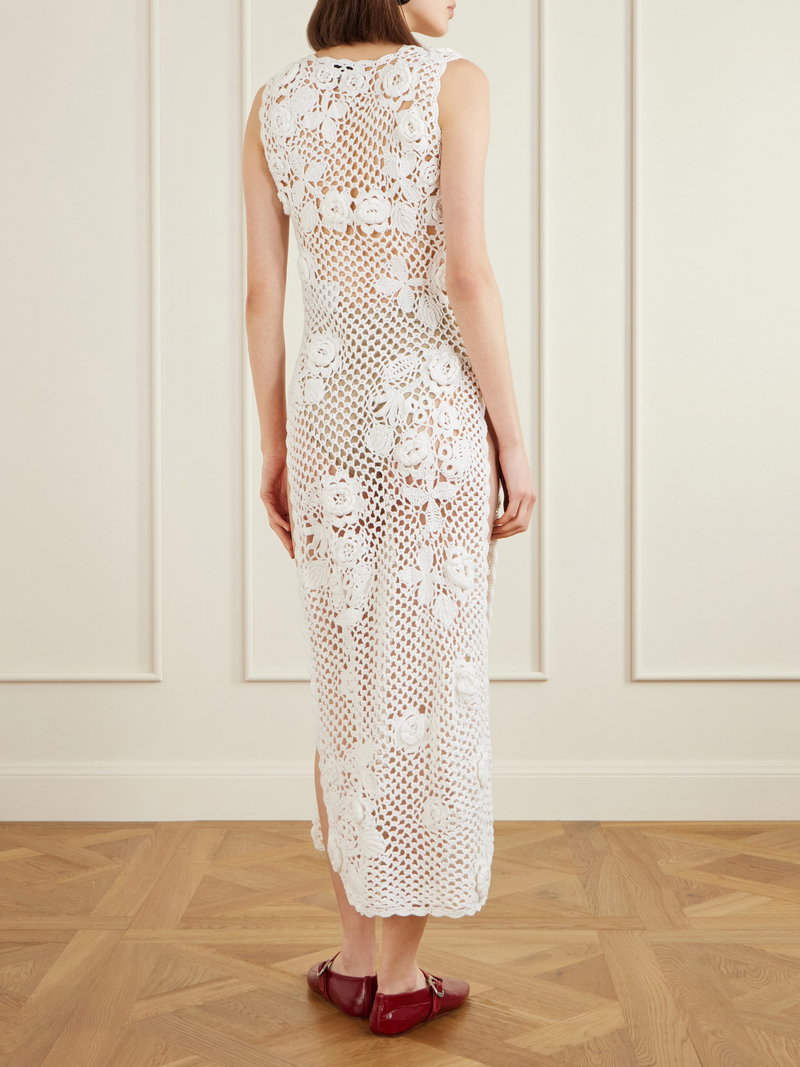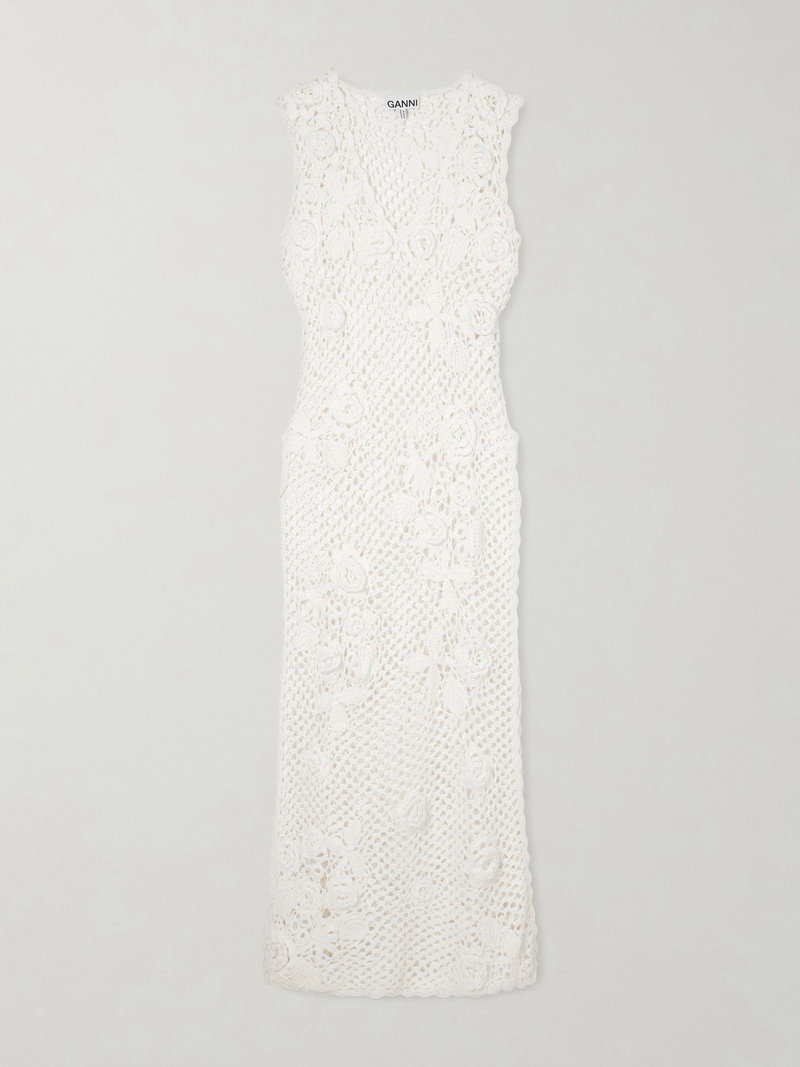 Ganni’s playful energy comes through in this dress. Made from cotton crochet-knit, it has a V-neckline and is cut for a slim fit that falls to a maxi length. Style yours with biker boots for contrast.