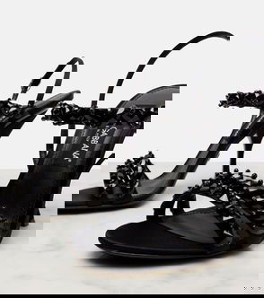 Sandals, Faux leather, Logo-appliquéd, Crystals, Knotted, Open square toe, Virgule heel, Ties at calf, Rubber sole.