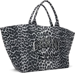 Ganni cotton shopper. Twin top handles, graphic print design at front, all-over leopard pattern, one main compartment, one interior zipped pocket, one interior patch pocket.