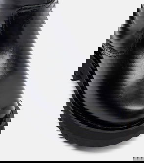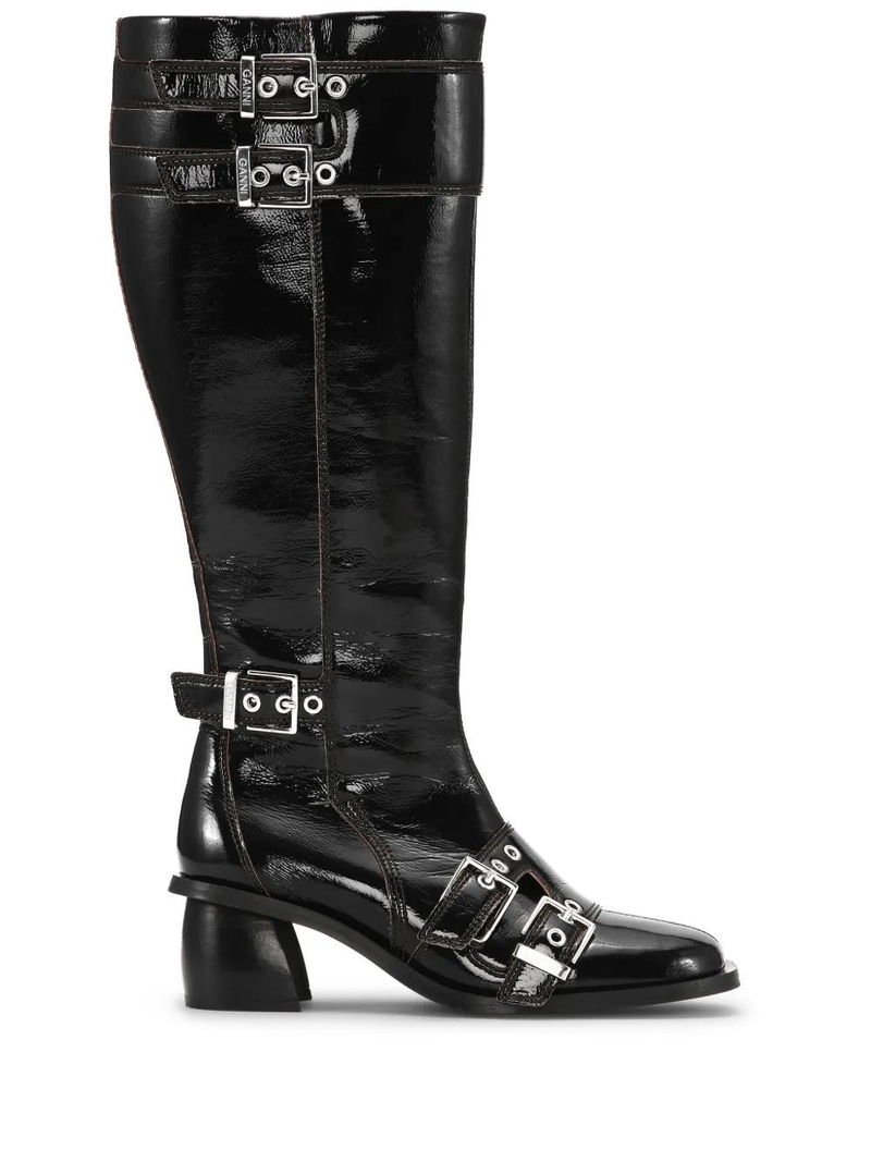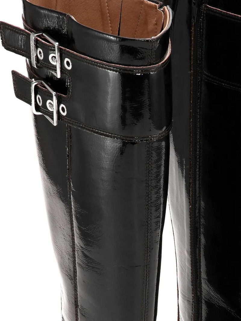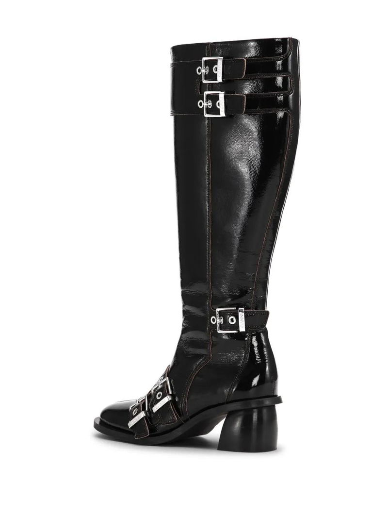 Black, polished finish, double buckle fastening, side zip fastening, square toe, contrast lining, silver-tone hardware, mid block heel, knee-high.