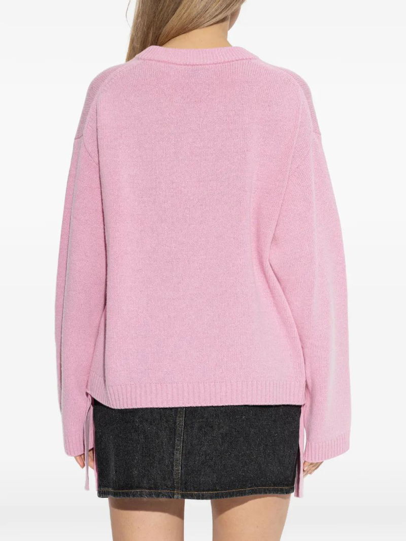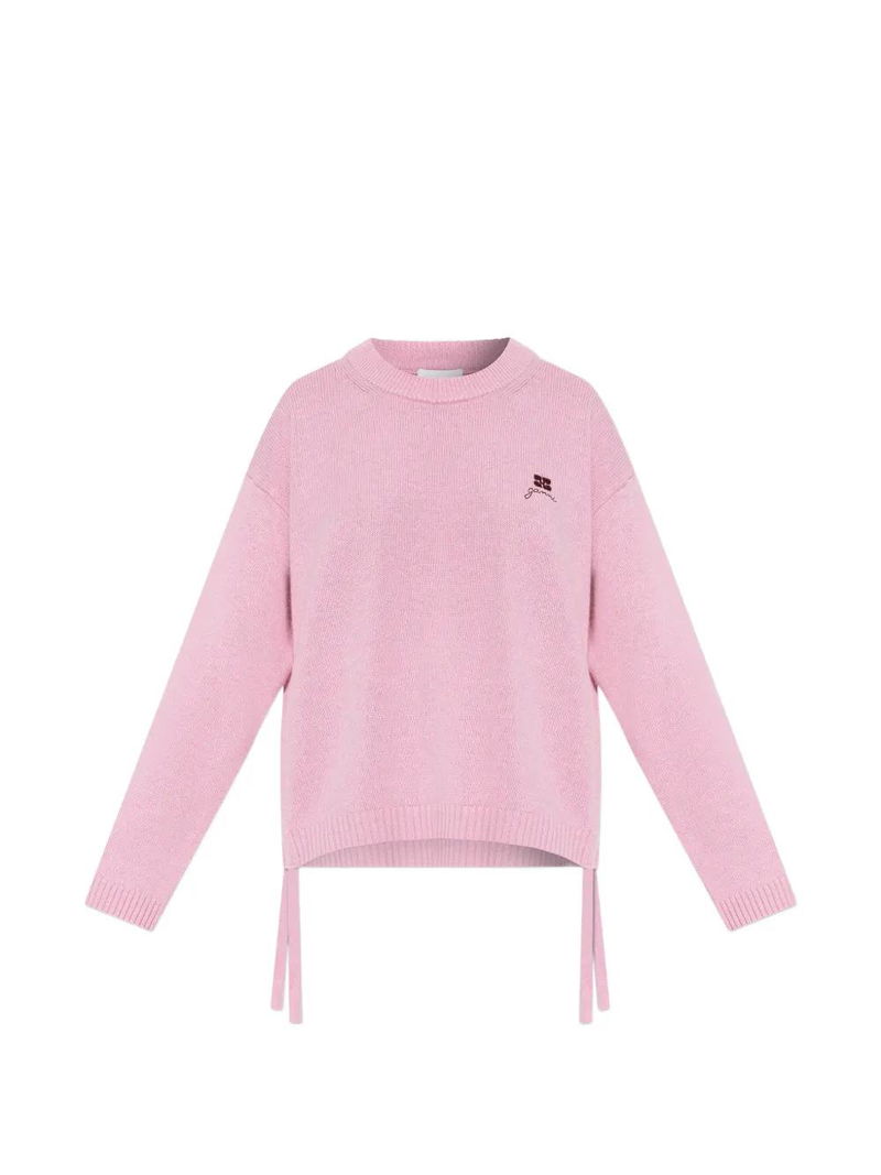 Light pink, embroidered detail, tie fastening, ribbed knit, round neck, long sleeves.