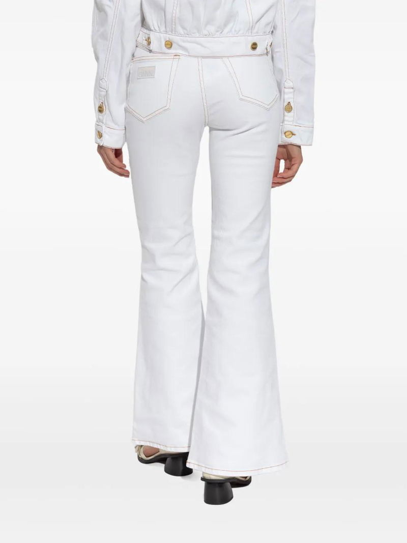 White, front button and zip fastening, belt loops, side patch pockets, two rear patch pockets.