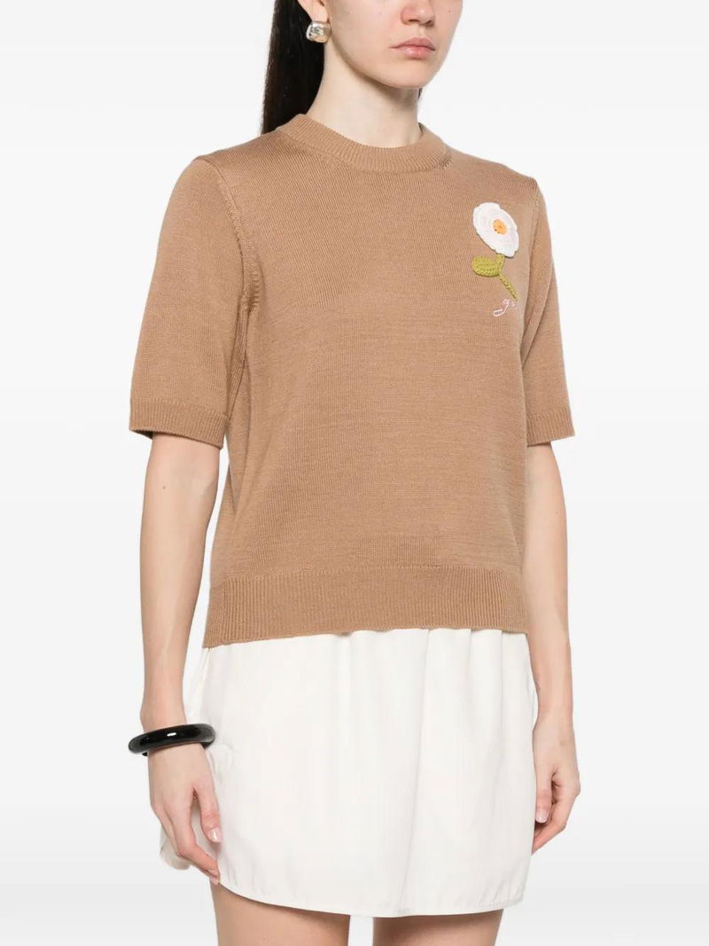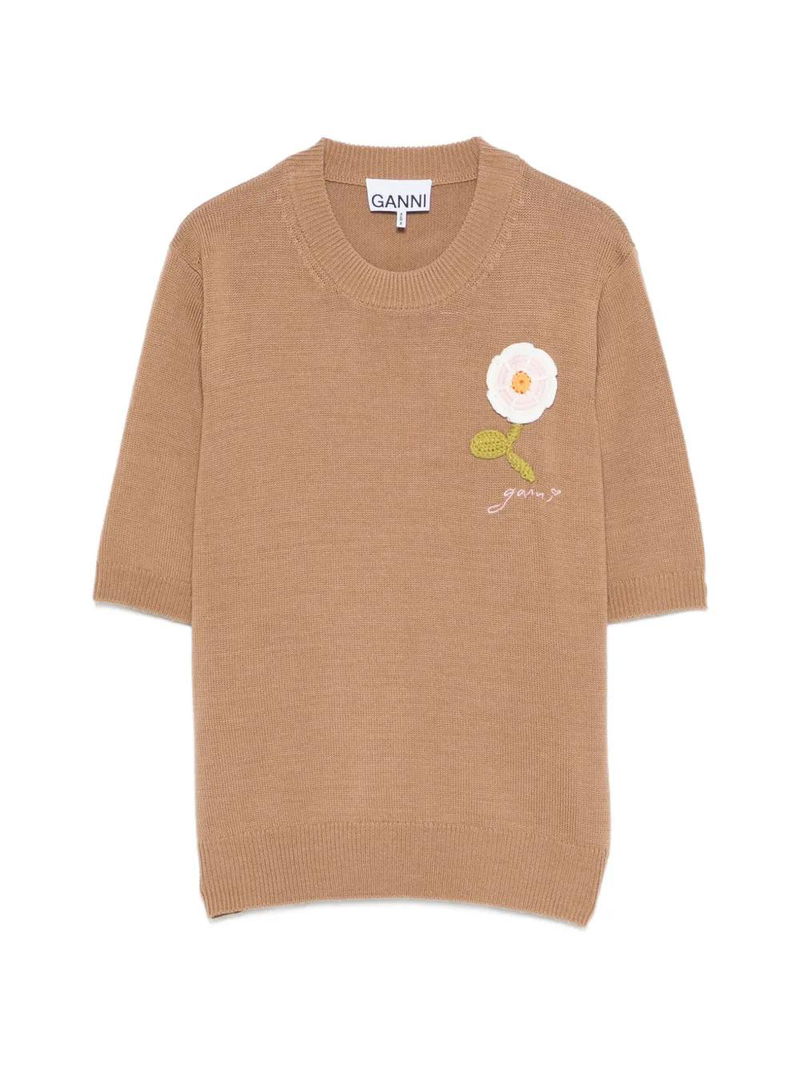 Brown floral appliqué round neck short sleeves ribbed hem ribbed cuffs.