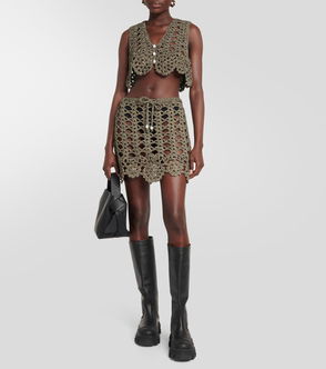 Recycled crêpe short skirt featuring graphic pattern in multicolor. Ruffled detailing throughout.· Mid-rise· Elasticized waistband· Modified scalloped hem.