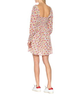 Recycled polyester-blend brocade dress. Jacquard floral pattern throughout.· Square neck· Puff sleeves· Elasticized shoulders and cuffs.