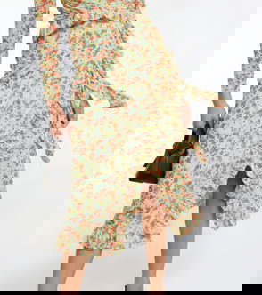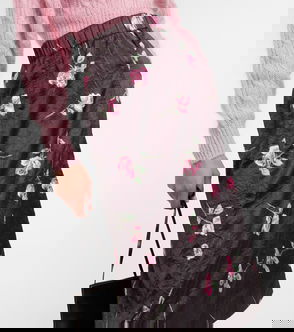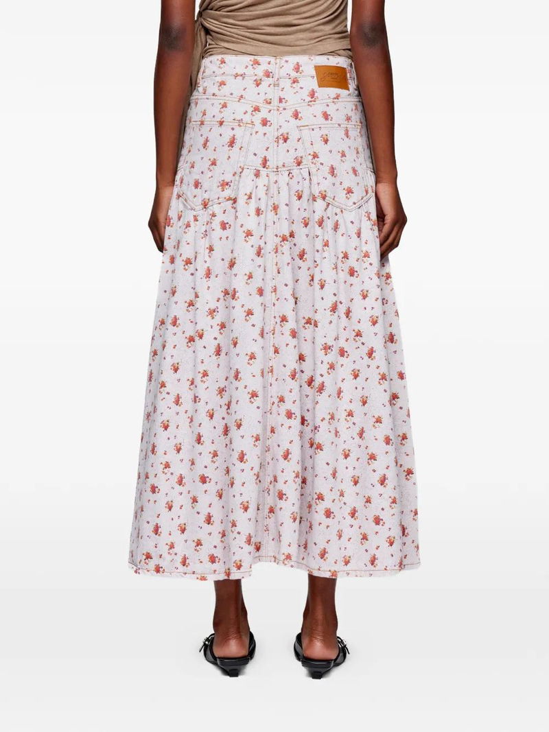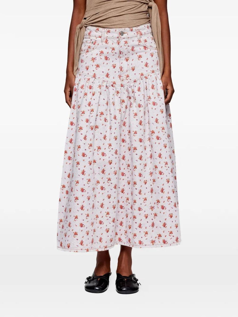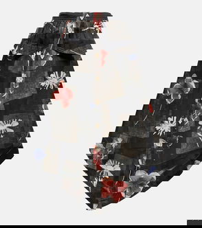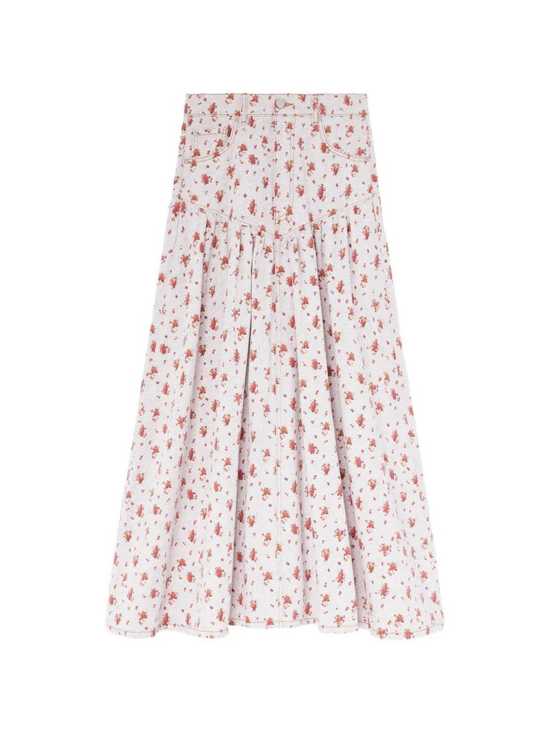 White and red, floral print, front pockets, rear patch pocket, button fastening.