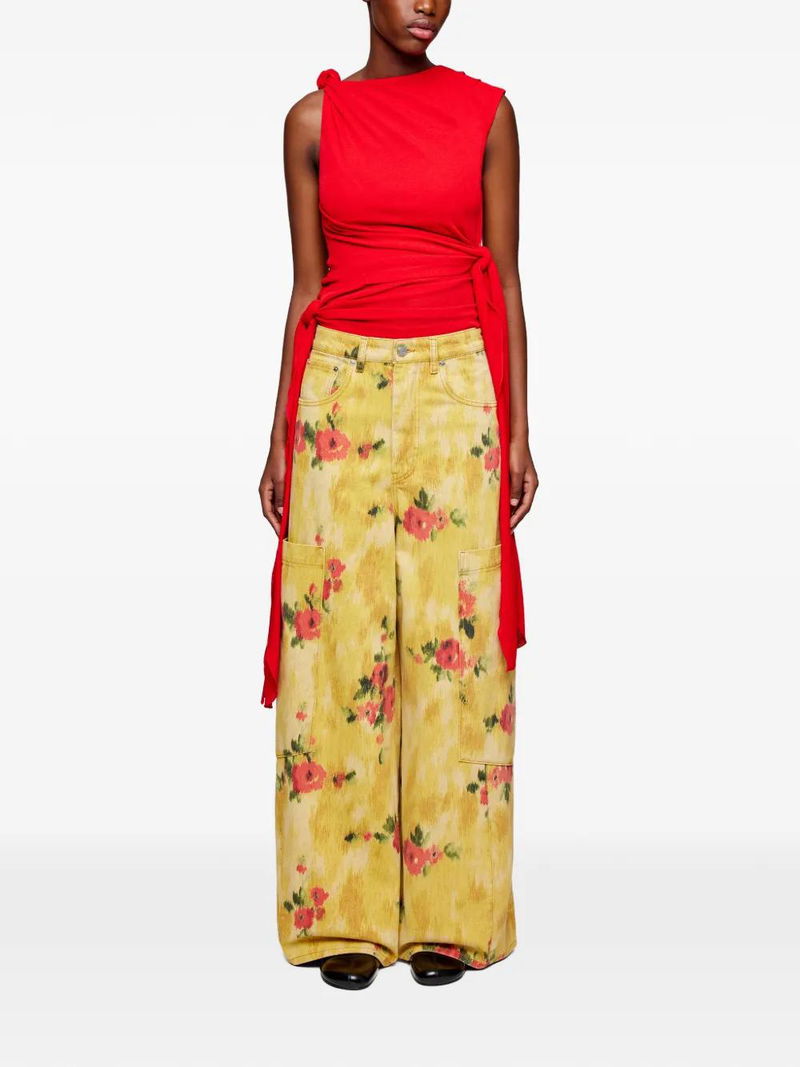 Yellow, floral print, patch pockets, belt loops, five pockets.
