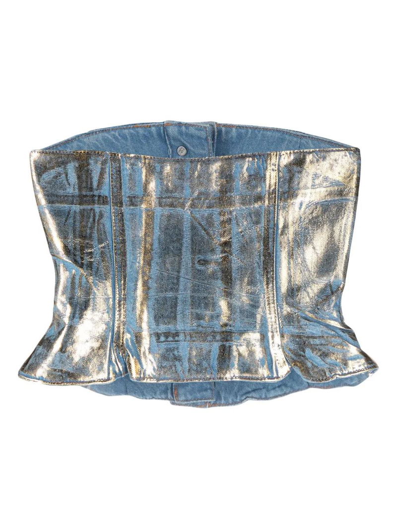 Sky blue organic cotton foiled finish bonded seams logo-engraved gold-tone hardware square neck front button fastening strapless straight hem.