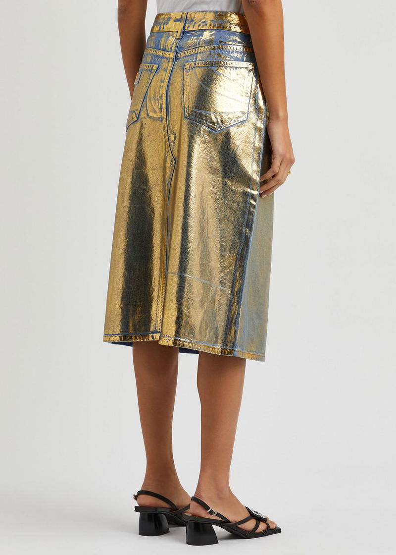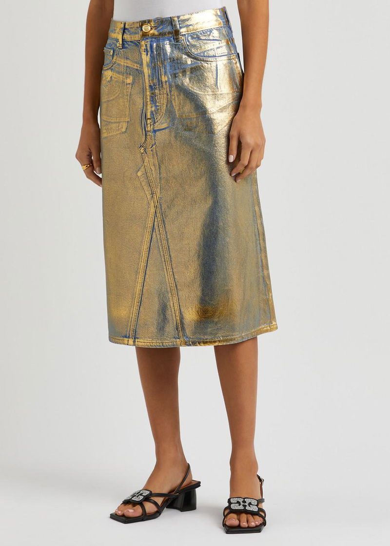 Ganni denim skirt. Belt loops, five pockets, foil print, logo print at back Partially concealed button and zip fastening at front.