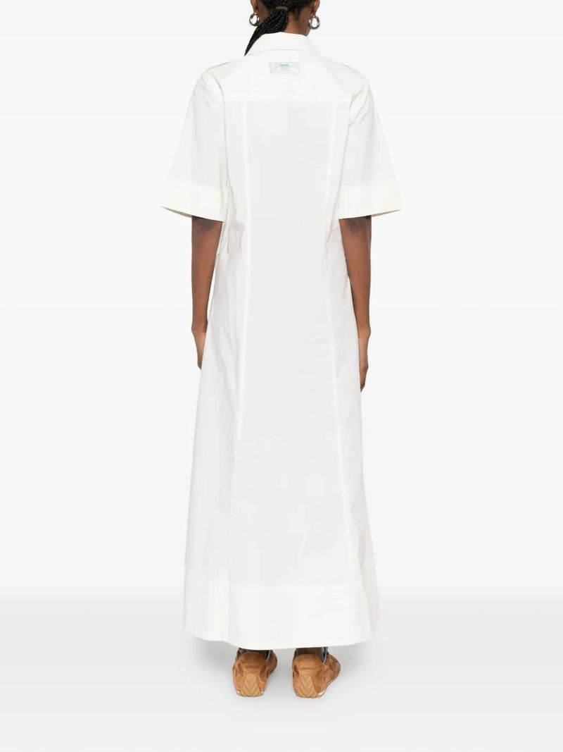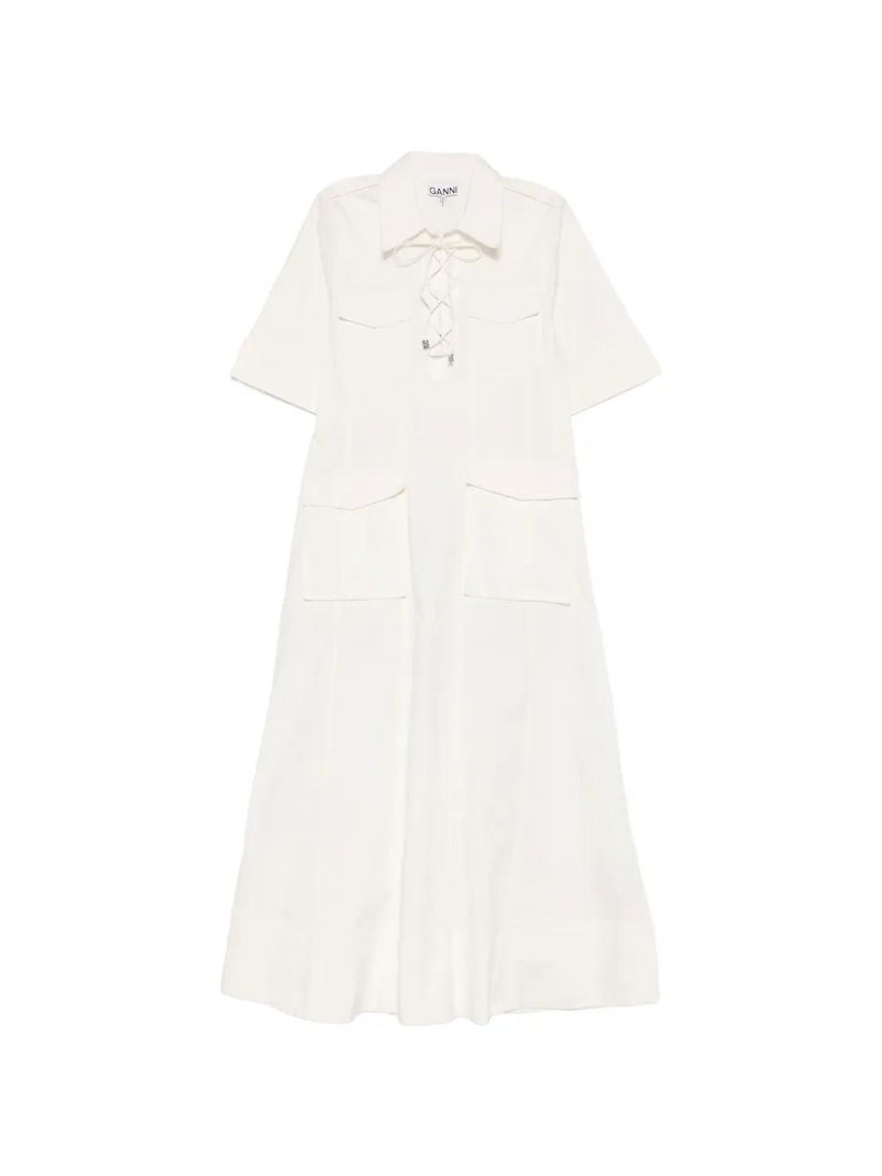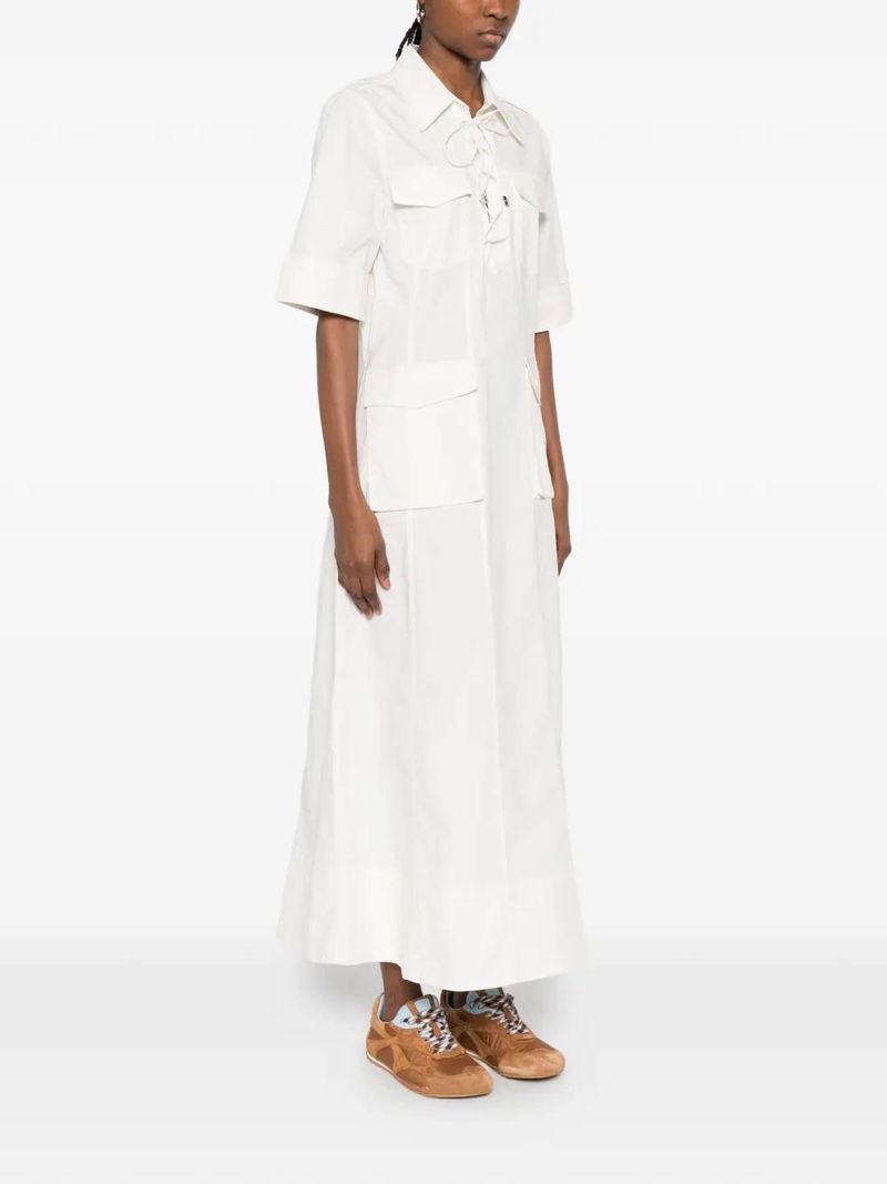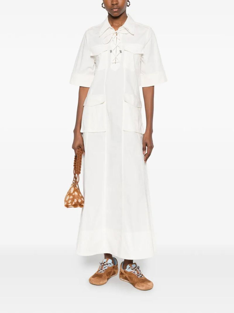 White, shirt collar, front pockets, front lace-up detail, short sleeves, A-line skirt.