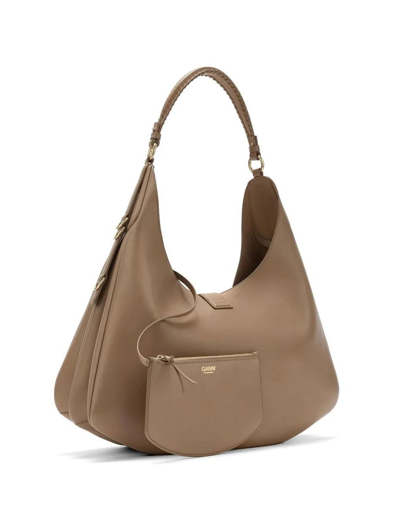 Brown detachable pouch magnetic fastening gold-tone hardware.