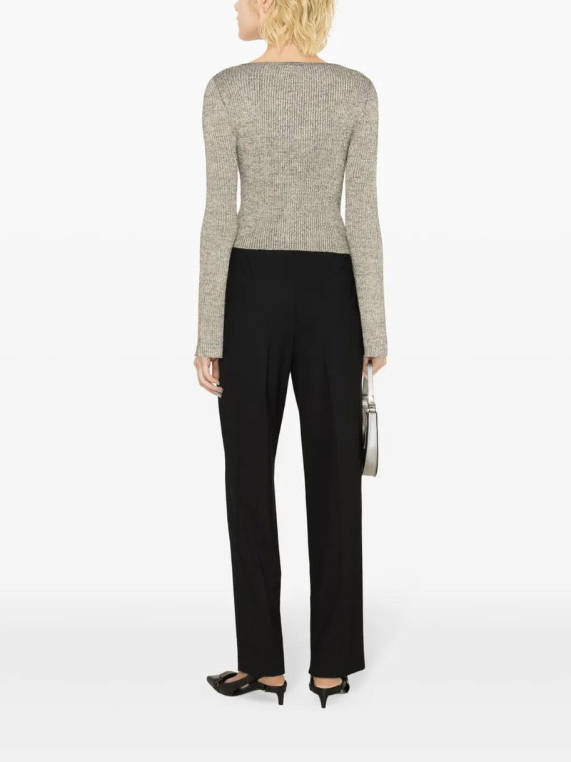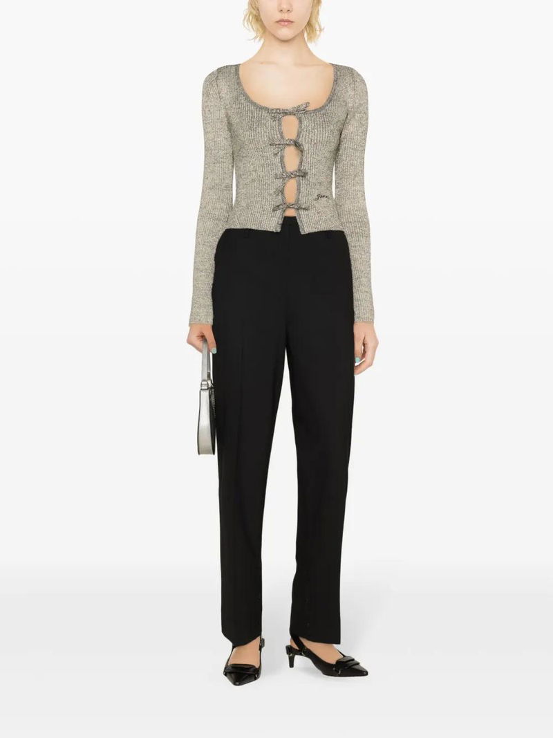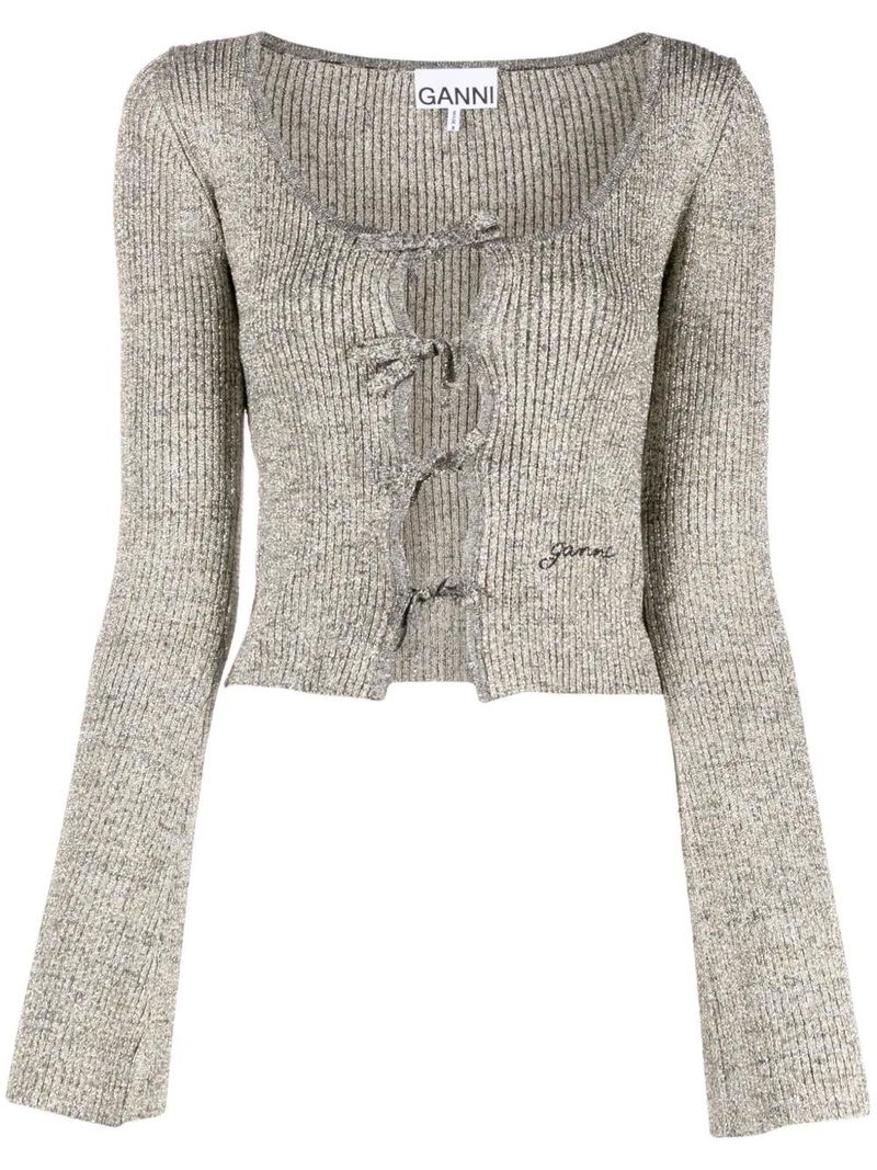 silver-tone recycled polyester ribbed knit embroidered logo to the front lurex detailing scoop neck front tie fastening long sleeves flared cuffs straight hem