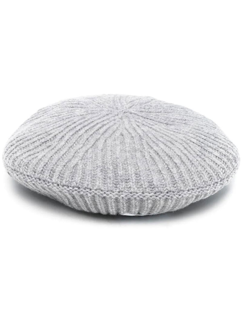 Light grey, wool blend, knitted construction, ribbed detailing, logo patch to the front.