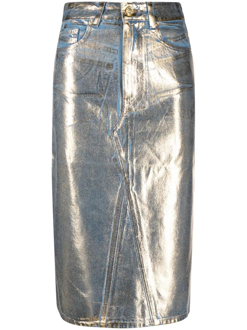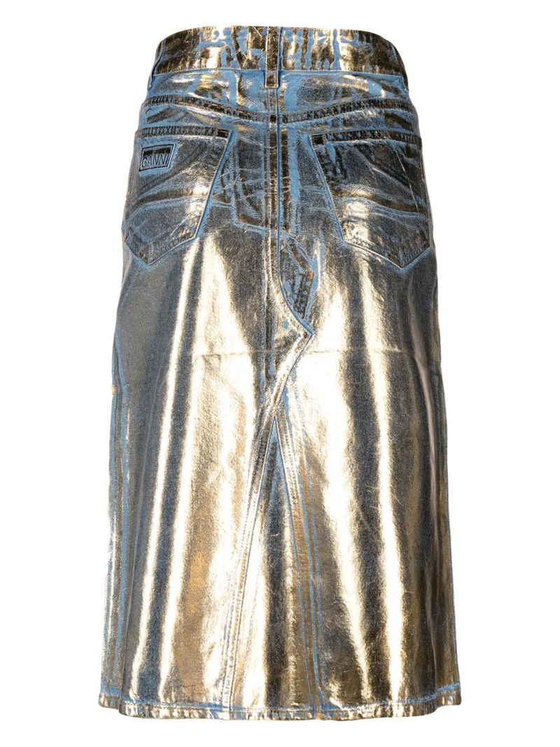 Gold-tone/light blue organic cotton denim metallic finish concealed fly and button fastening belt loops classic five pockets straight hem.
