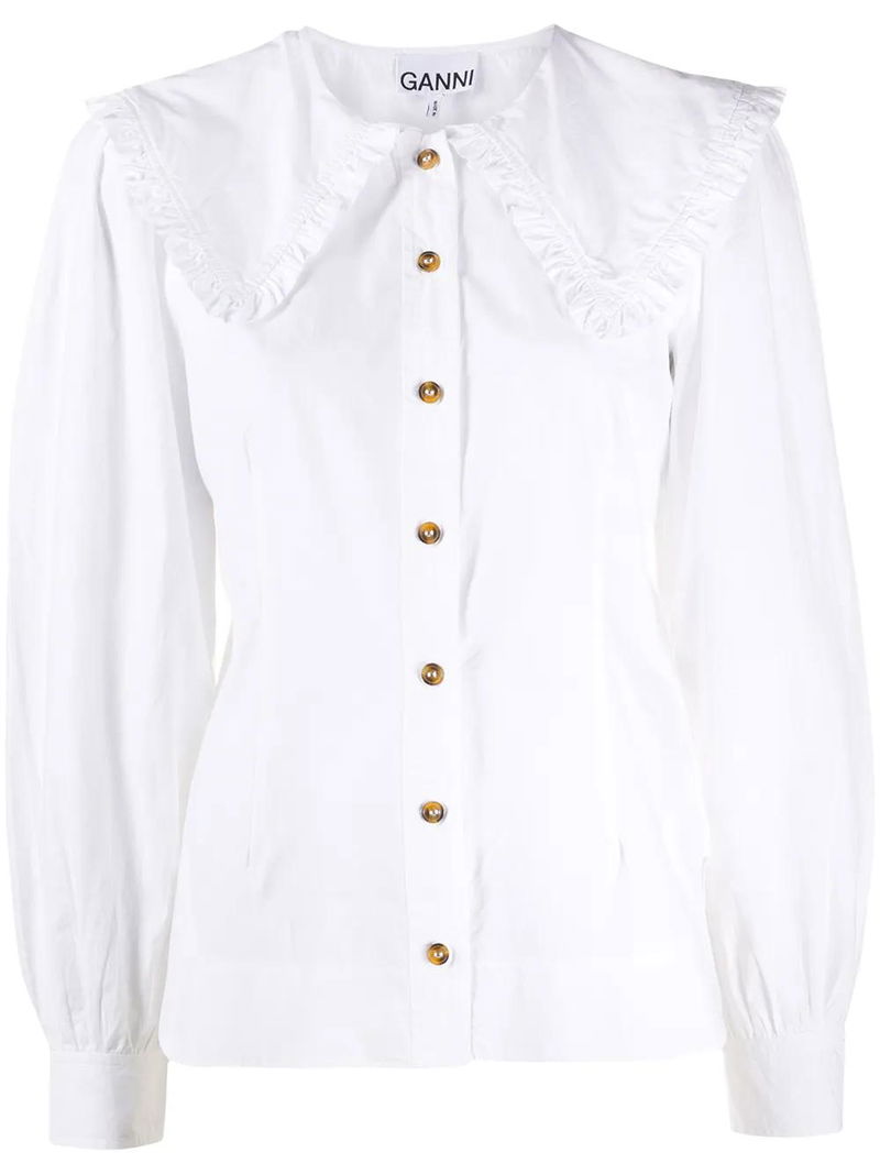 Bright white, organic cotton, oversized collar, front button fastening, long puff sleeves, buttoned cuffs, curved hem.