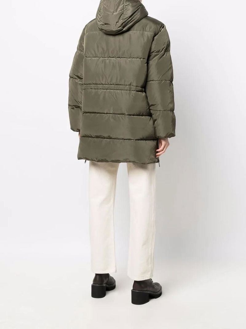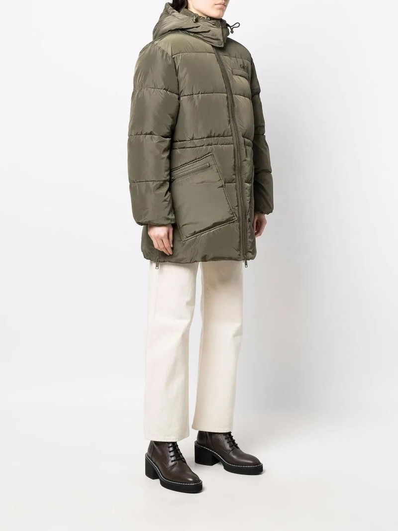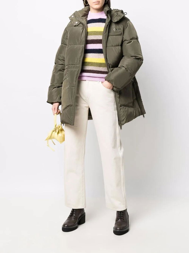 yellow padded design logo print at the chest detachable hood stand-up collar front two-way zip fastening long sleeves mid-length two side zip-fastening pockets