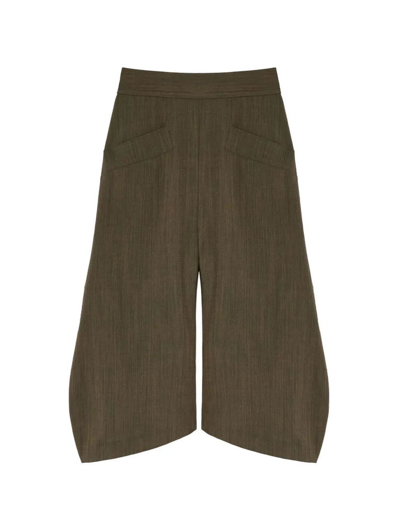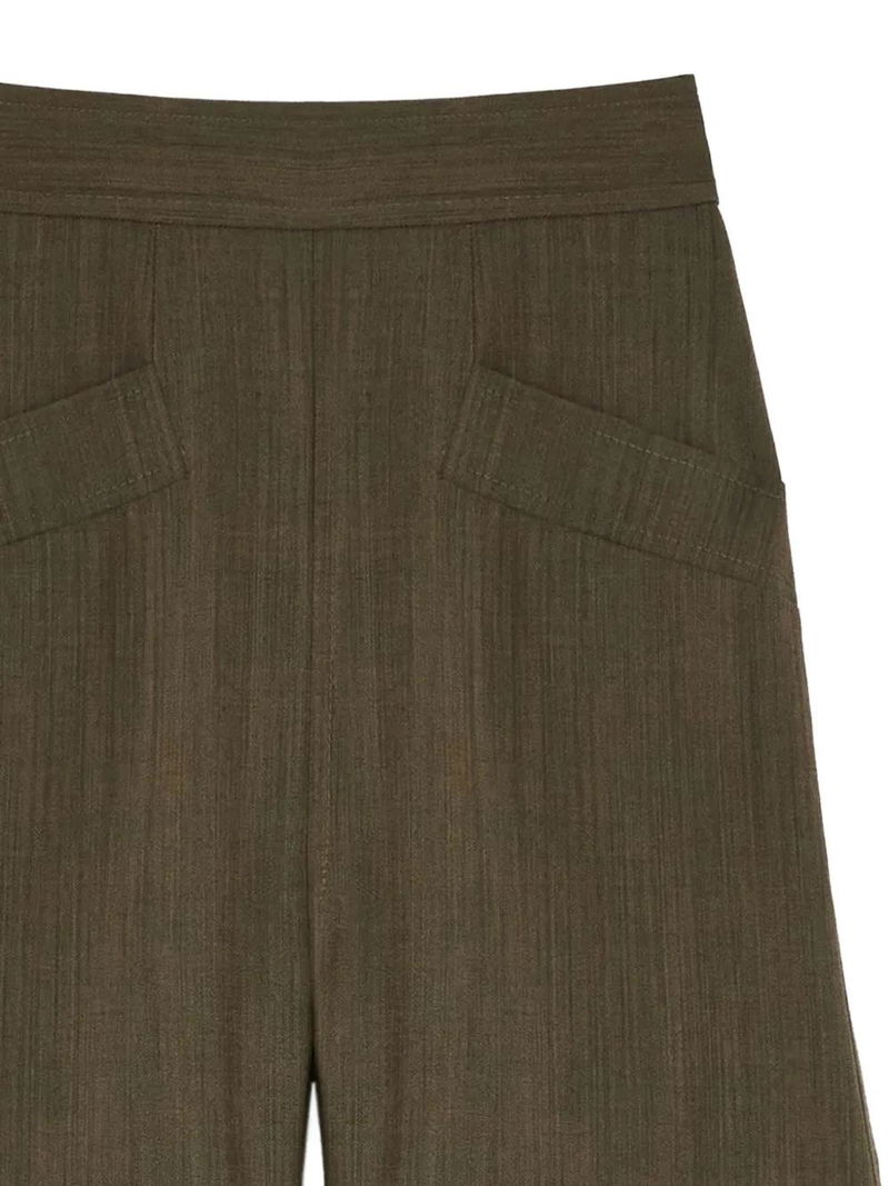 Olive green, front pockets, high-waisted, concealed fastening.