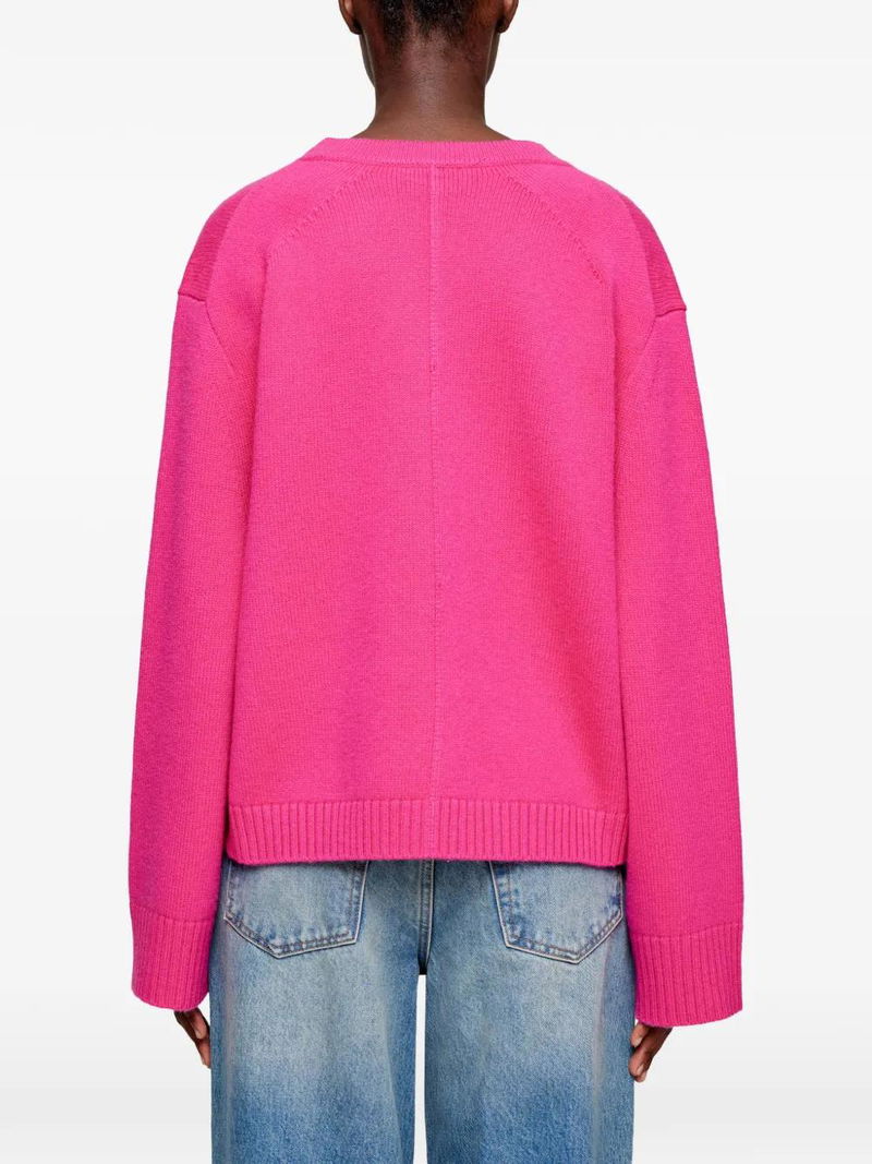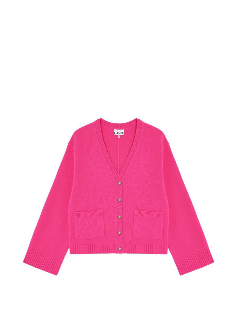 Fuchsia, V-neck, front button fastening, two front patch pockets, long sleeves, ribbed cuffs.