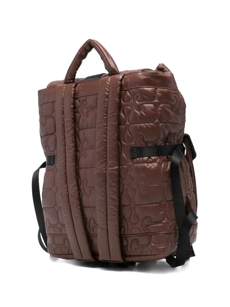 Brown quilted top handle front buckle fastening adjustable shoulder straps front flap closure.