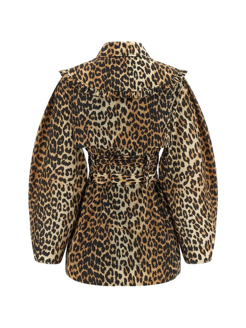 Brown leopard print, removable ruffle lapel, front button closure.