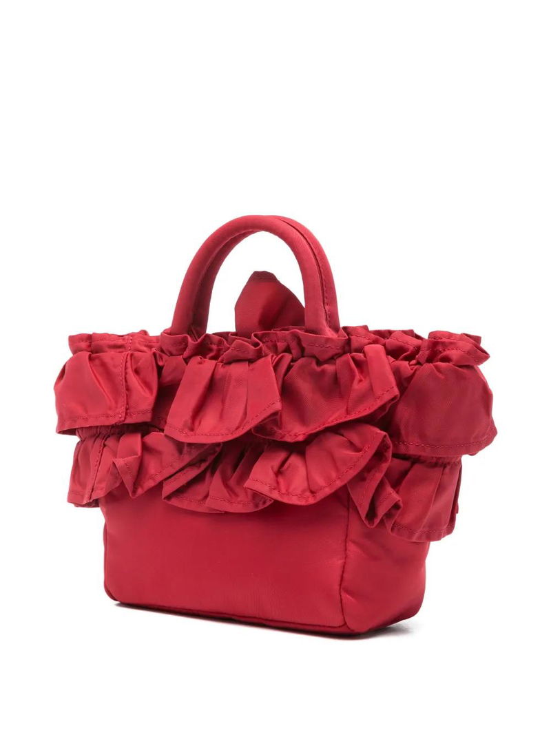 Red top handle detachable shoulder strap ruffle detail logo patch internal zip-fastening pocket.