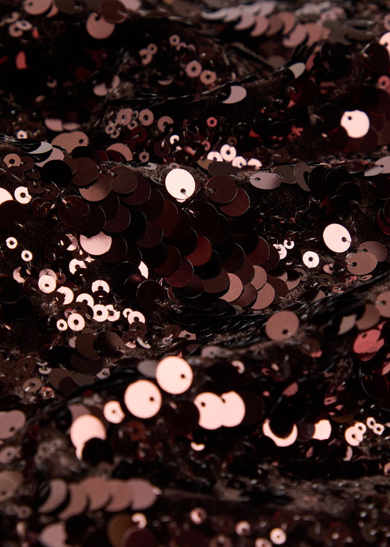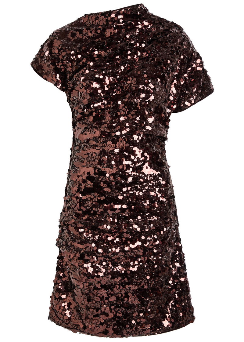 GANNI velvet dress. Sequin embellishments, funnel neck, cap sleeve on one side, gathered details, fully lined. Concealed zip fastening at shoulder.
