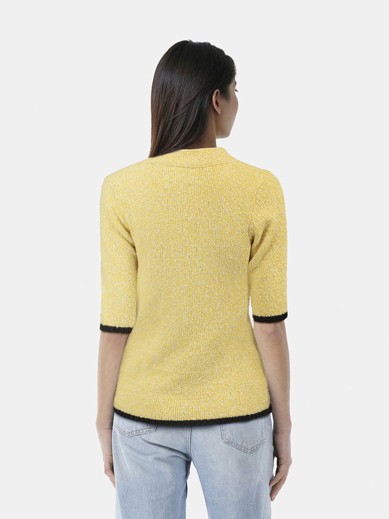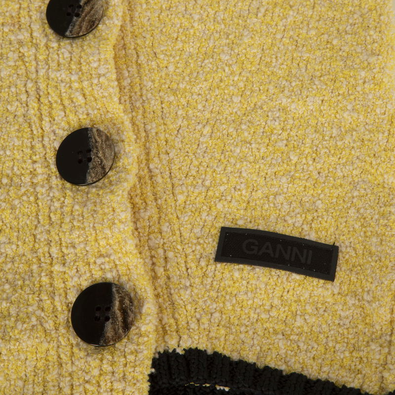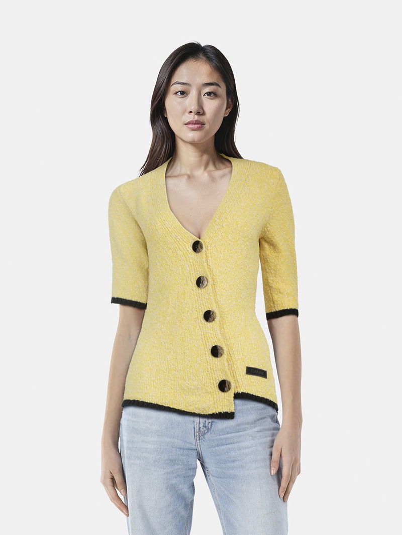 Fitted cardigan in organic cotton knit blend, finished with an asymmetrical button closure, contrasting black trim on hems, and long-length short sleeves.