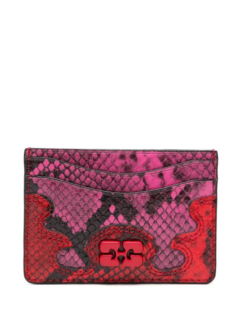 Pink and red, snake effect, logo detail, card slots, stitched trim.