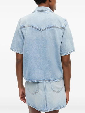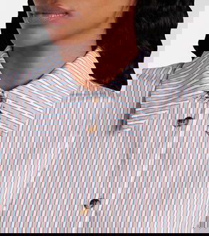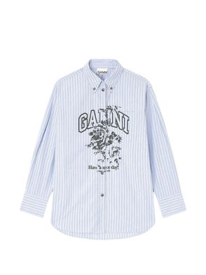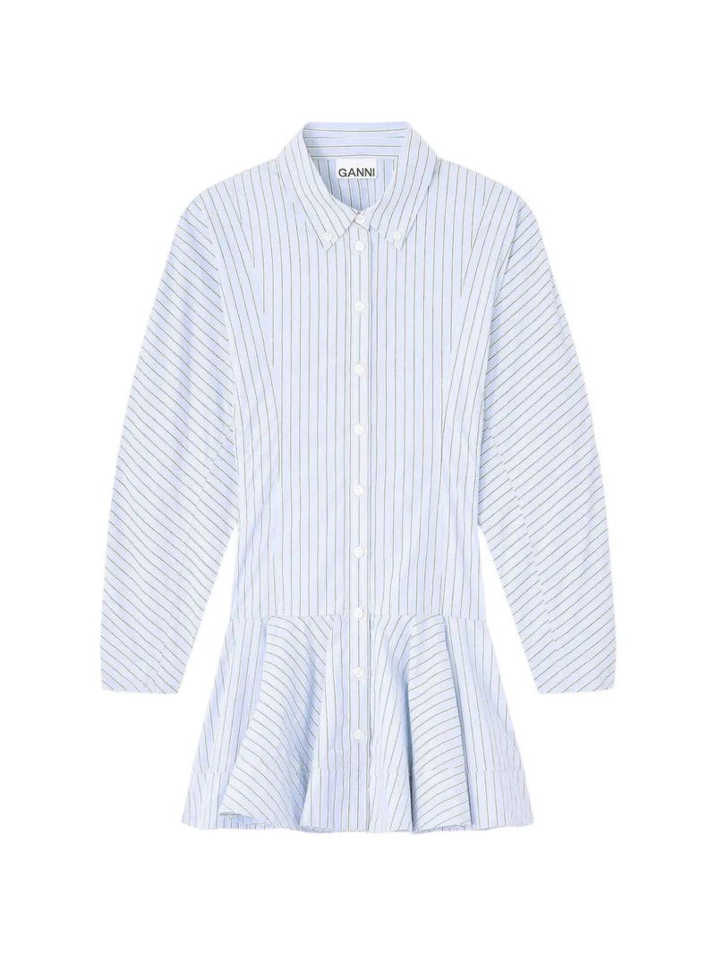 Light blue and white striped button fastening long sleeves ruffled hem.