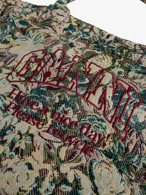 GANNI's tote is made from floral jacquard, inspired by vintage tapestry. It has leather trims and a branded luggage tag looped through the top handle. The inside fits your phone, tin of mints and house keys.